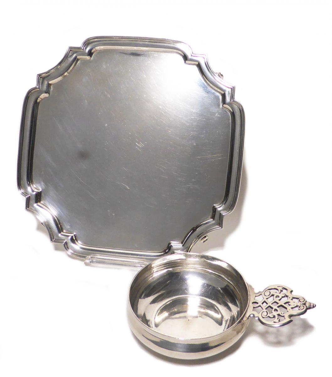 Beschau London 1755-56, Meistermarke WP (William Plummer, ab 1755, Grimwade Nr.3255). Zustand A/B. Beilage: Salver. Birmingham. 1929-30. Adie Brothers Ltd. Ca. 878g. 2,5x29,5x29,5 cm.