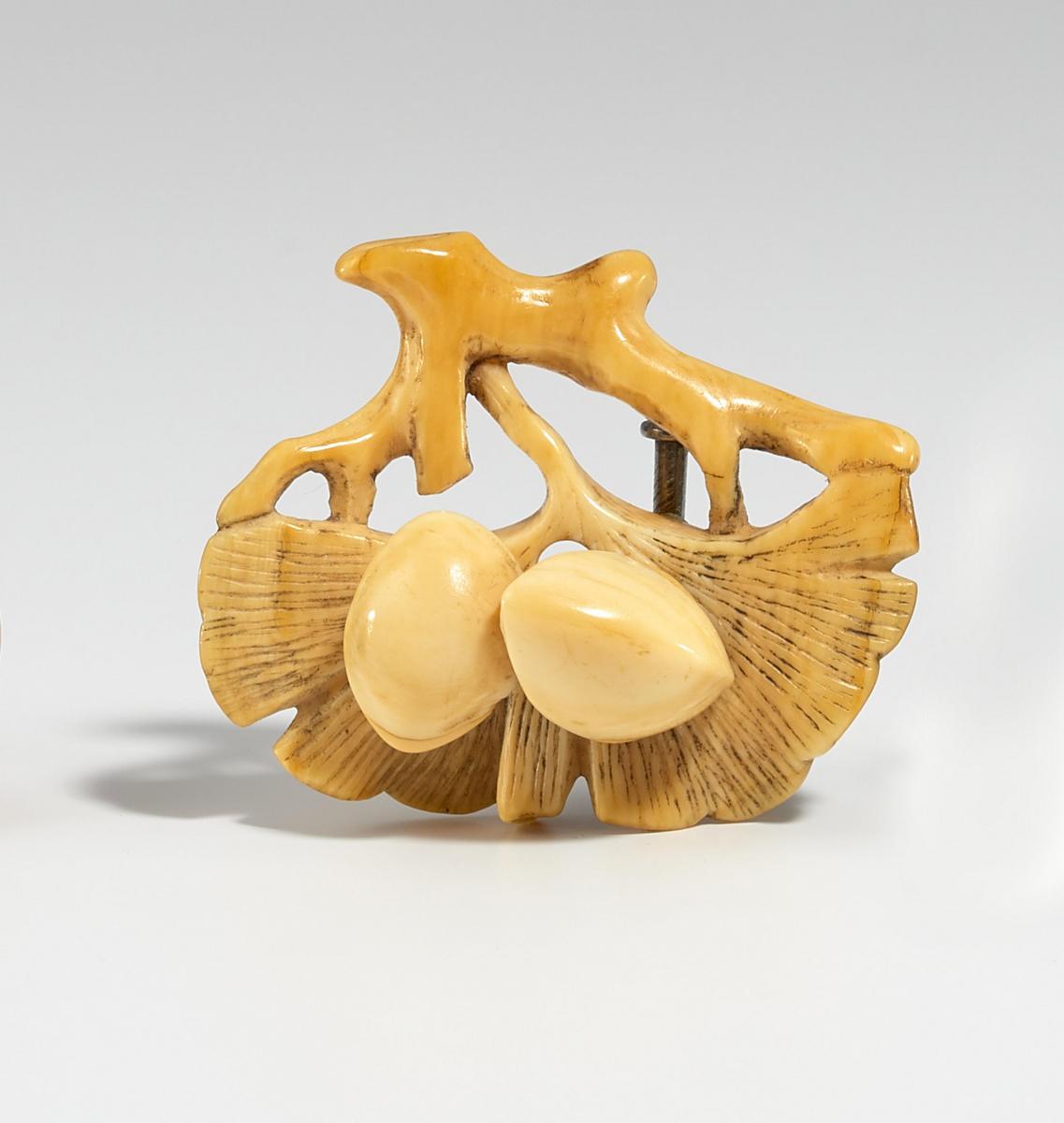 Beschreibung: Ginkgo-Zweig mit zwei Blättern und zwei Nüssen.