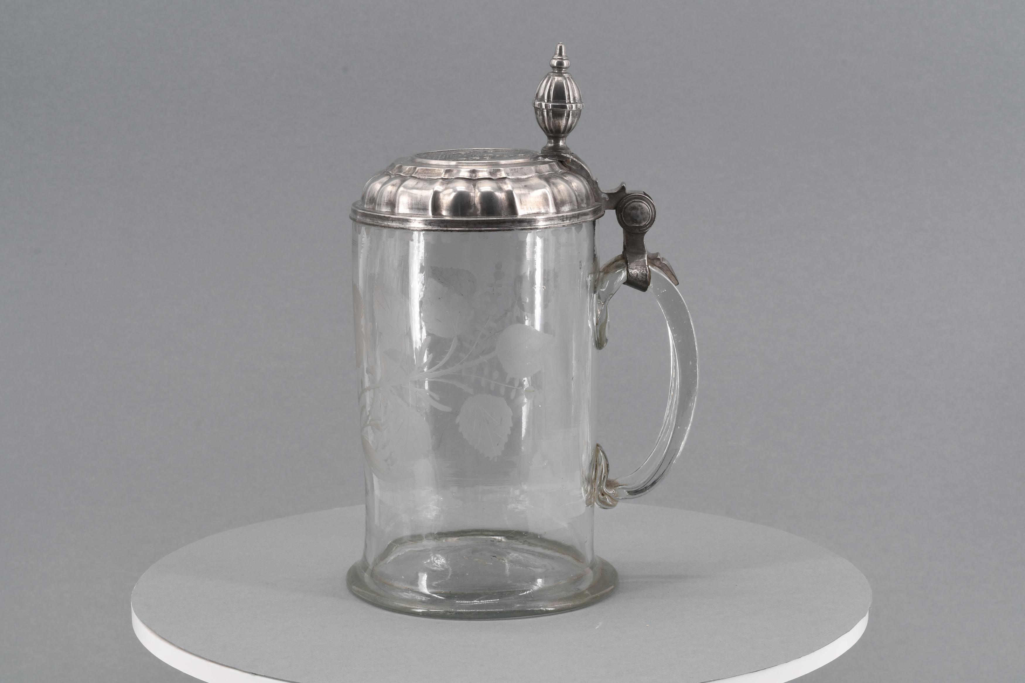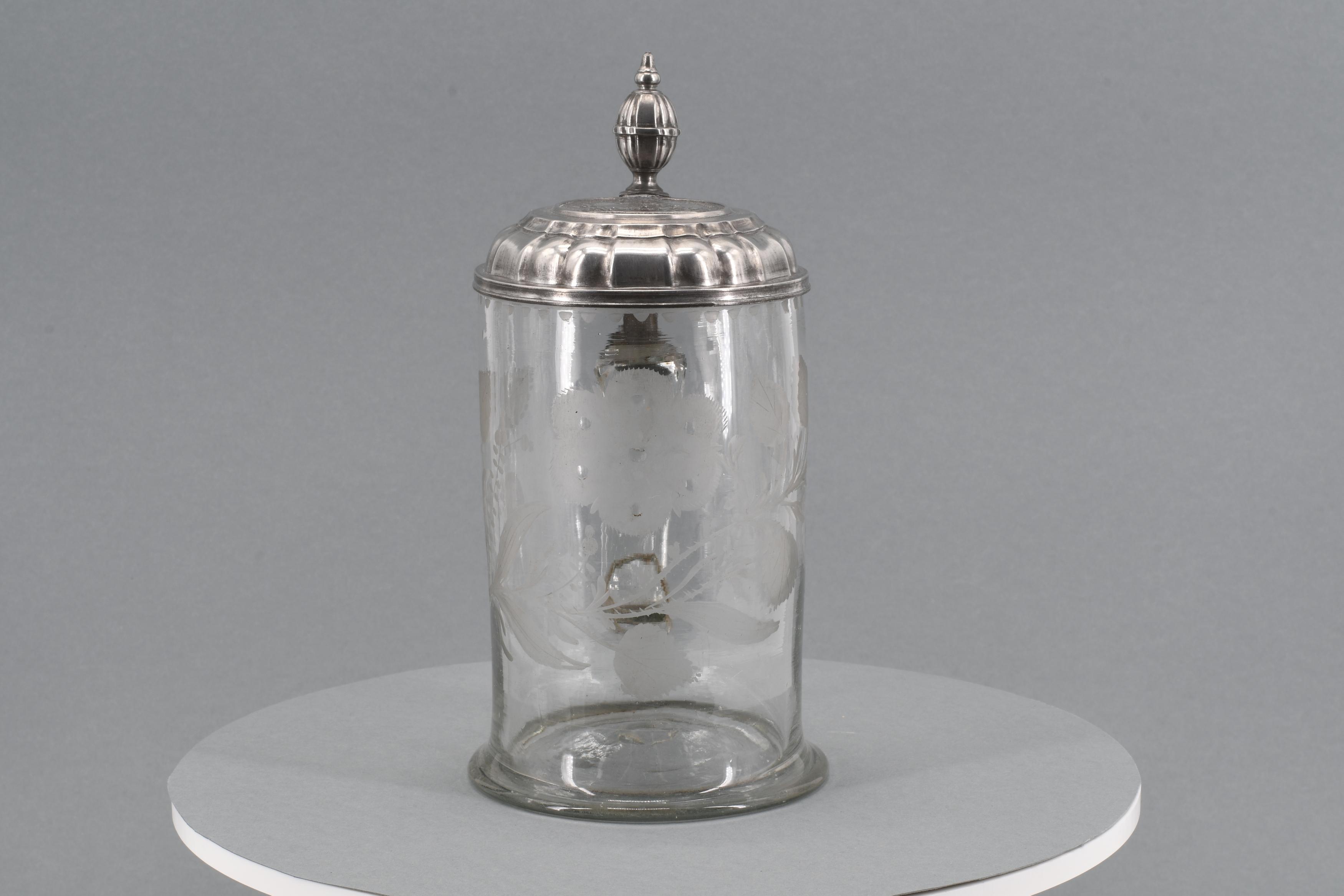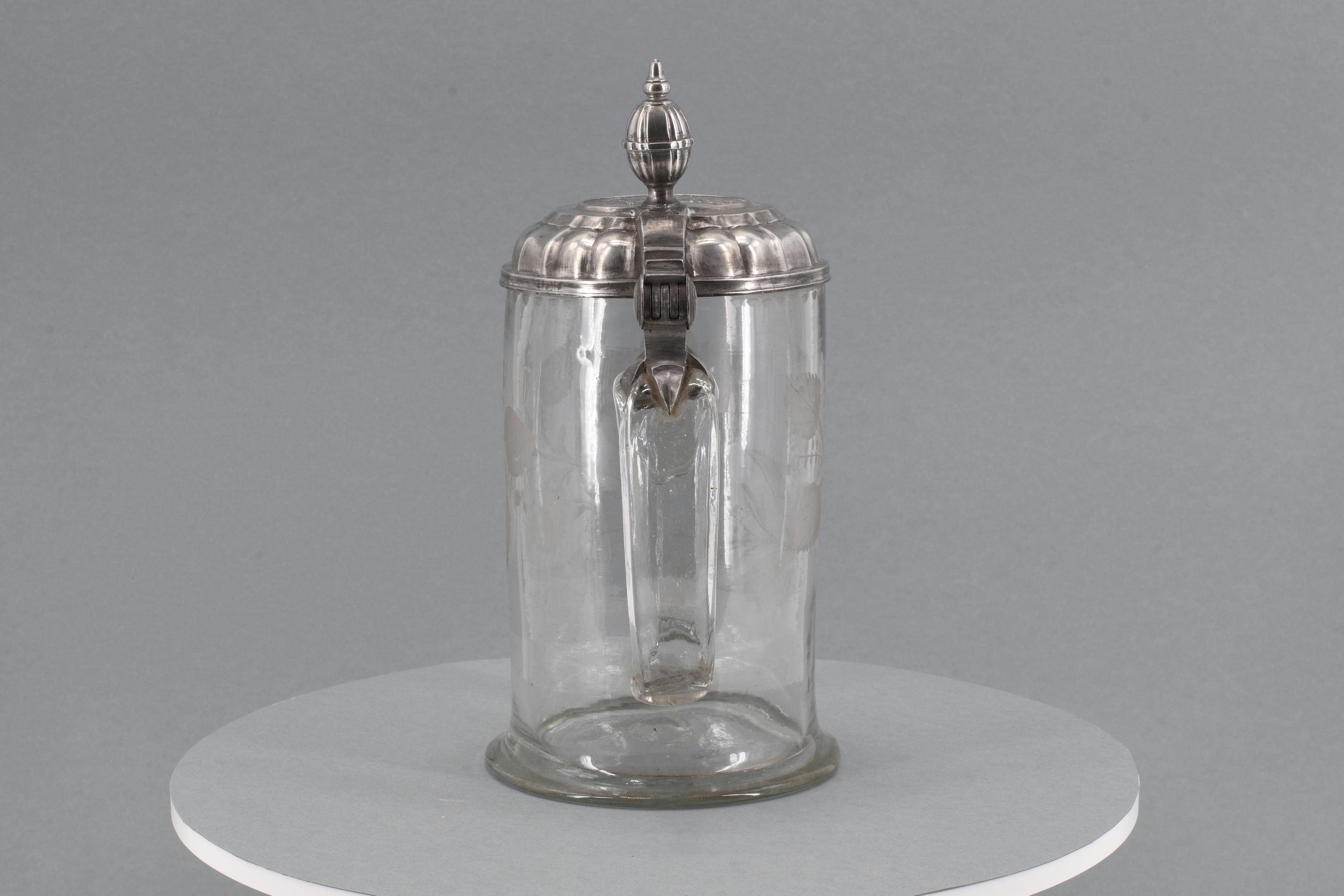 Beschreibung: Großer Glashumpen mit angeschmolzenem Bandhenkel und Zinndeckel. Zylindrische Wandung mit
