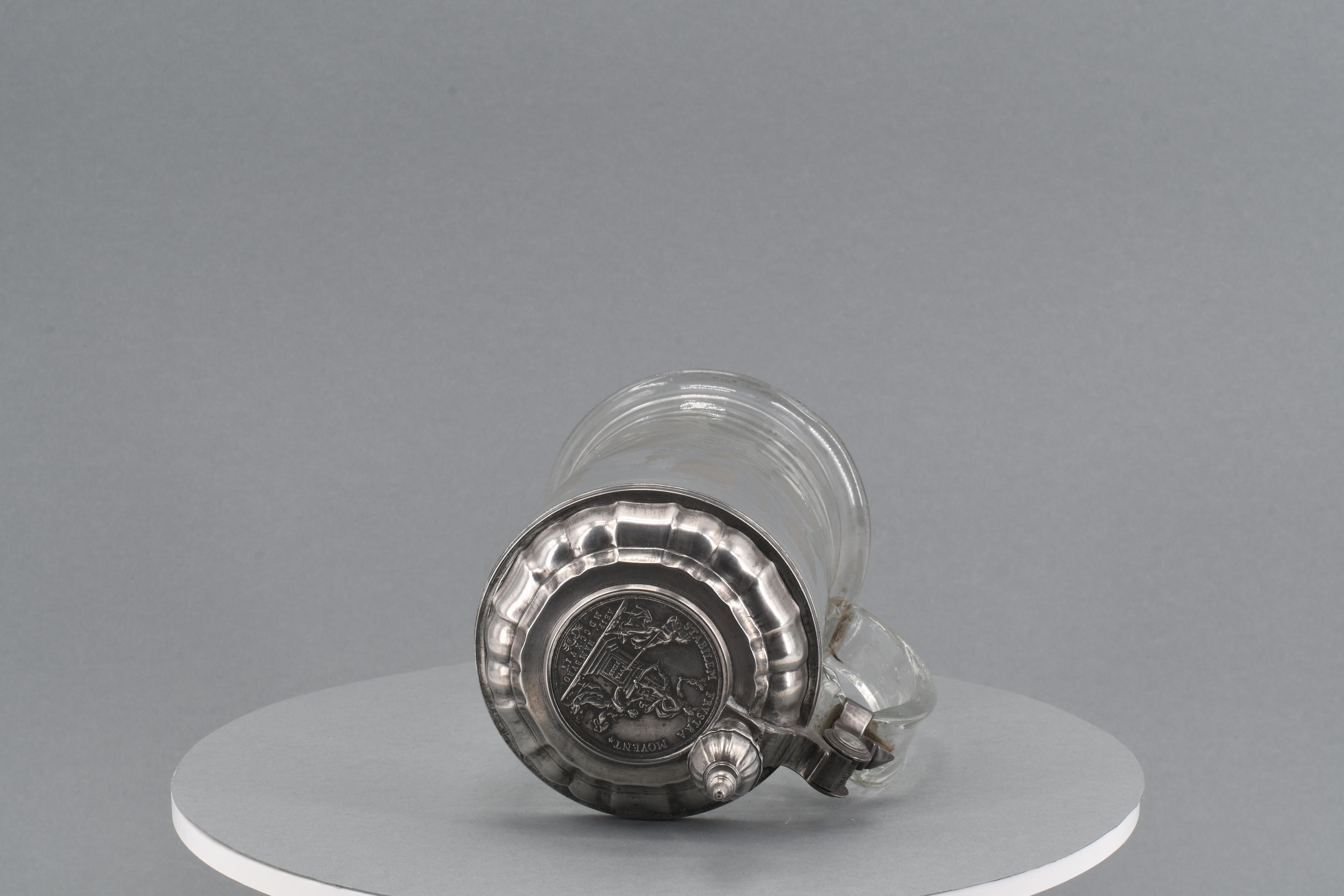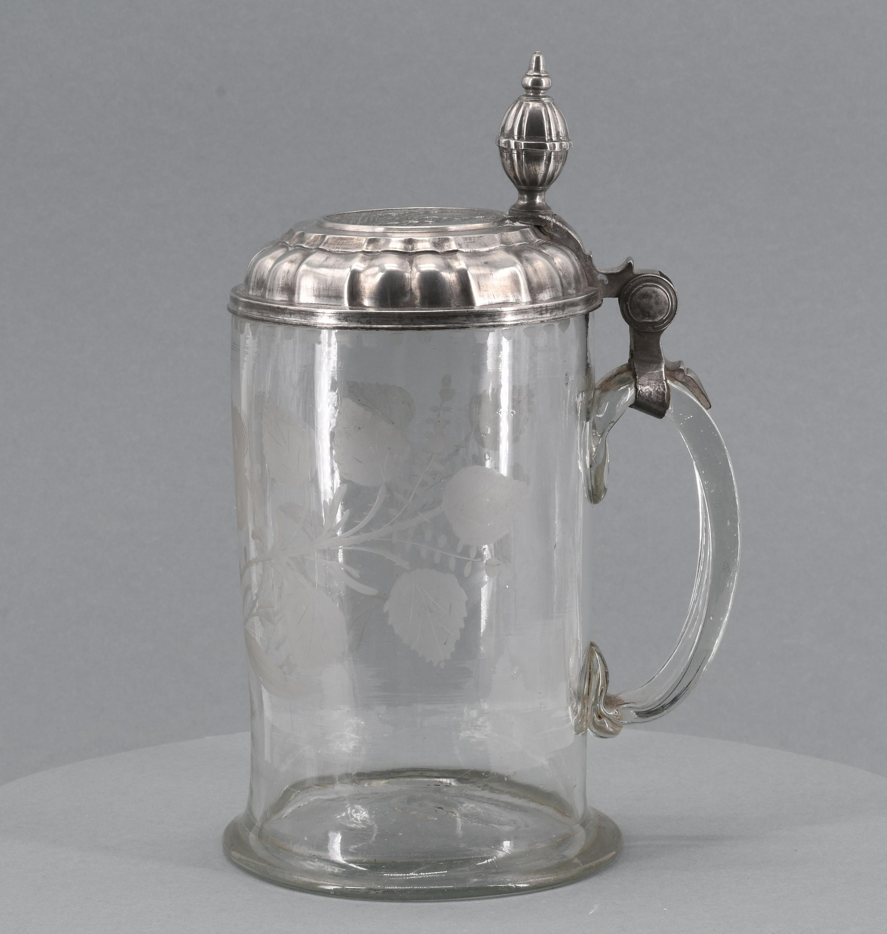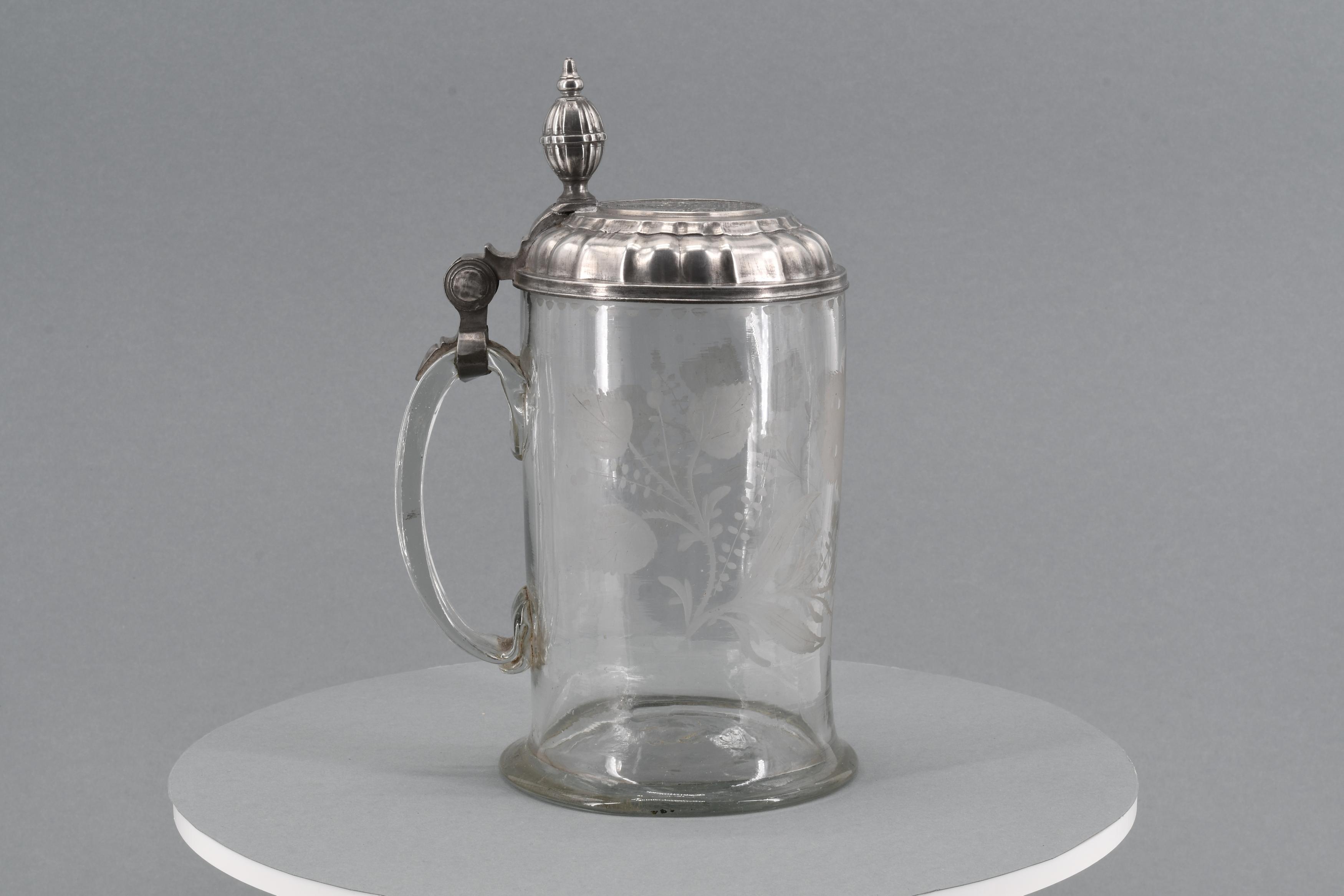 Beschreibung: Großer Glashumpen mit angeschmolzenem Bandhenkel und Zinndeckel. Zylindrische Wandung mit