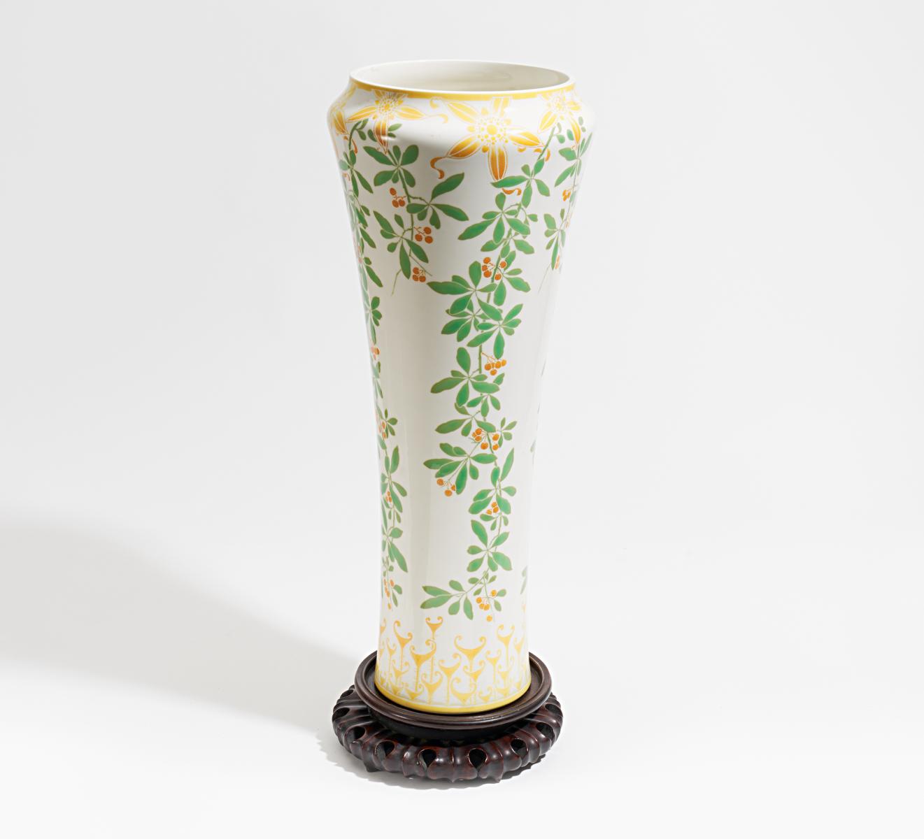 Material: Porzellan, farbiges Dekor. Holzsockel.