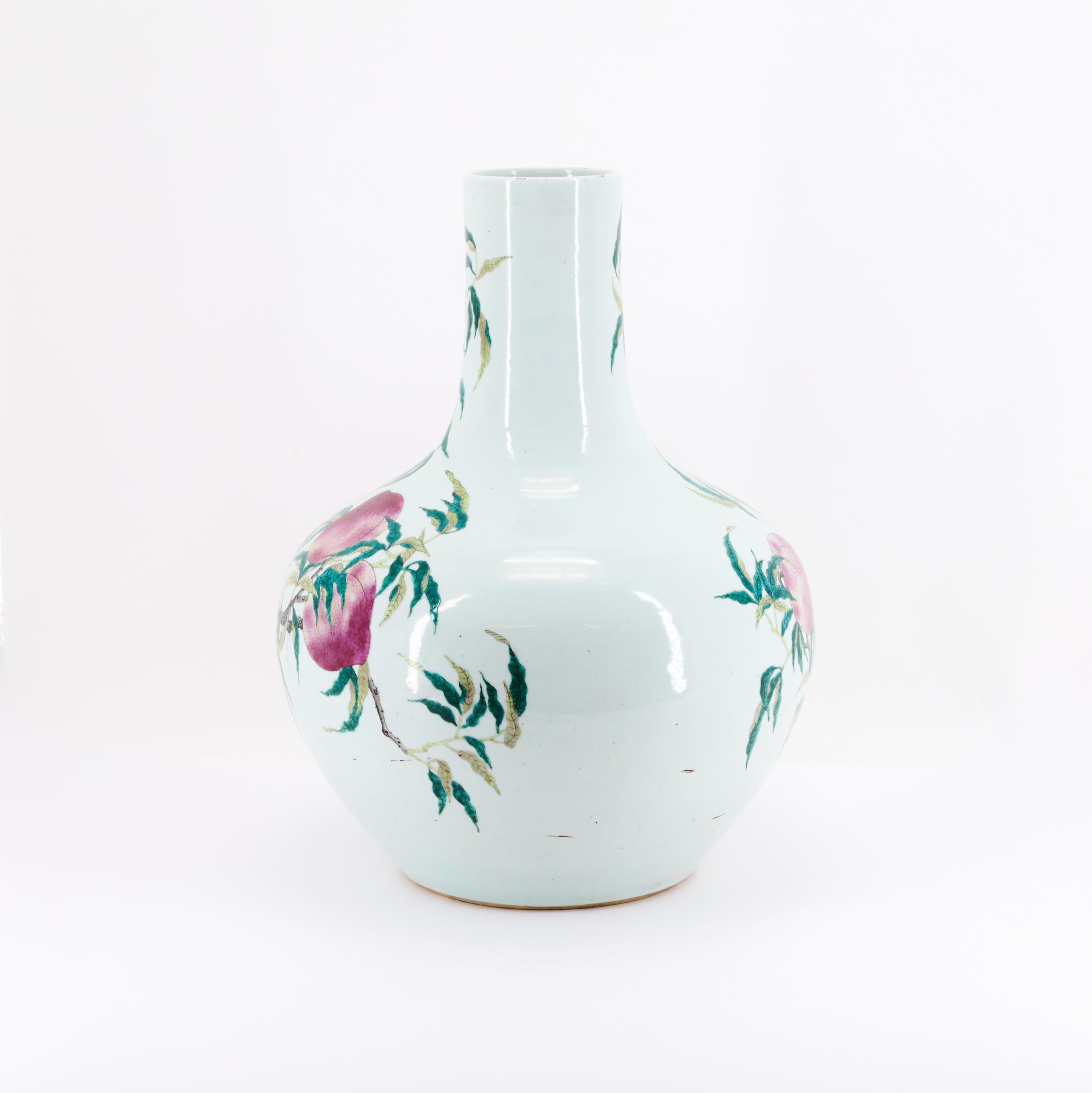 Beschreibung: Dekoriert in den Farben der Famille rose mit neun Pfirsichen zwischen blühenden Zweigen