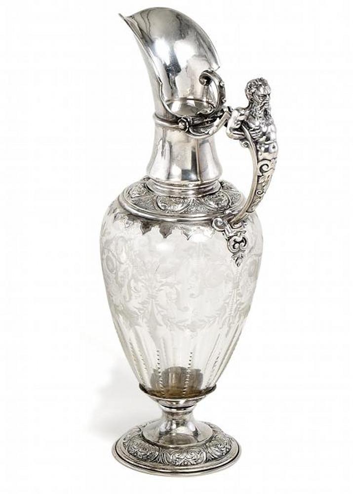 GROßE GLASKARAFFE MIT SILBERMONTIERUNG.