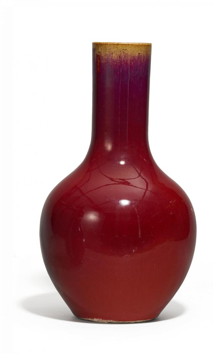 Technik: Porzellan mit Flambé-Glasur, die wie üblich am Fußring abgeschlagen ist. Boden transparent glasiert mit Krakelee und Ofensandanhaftung.