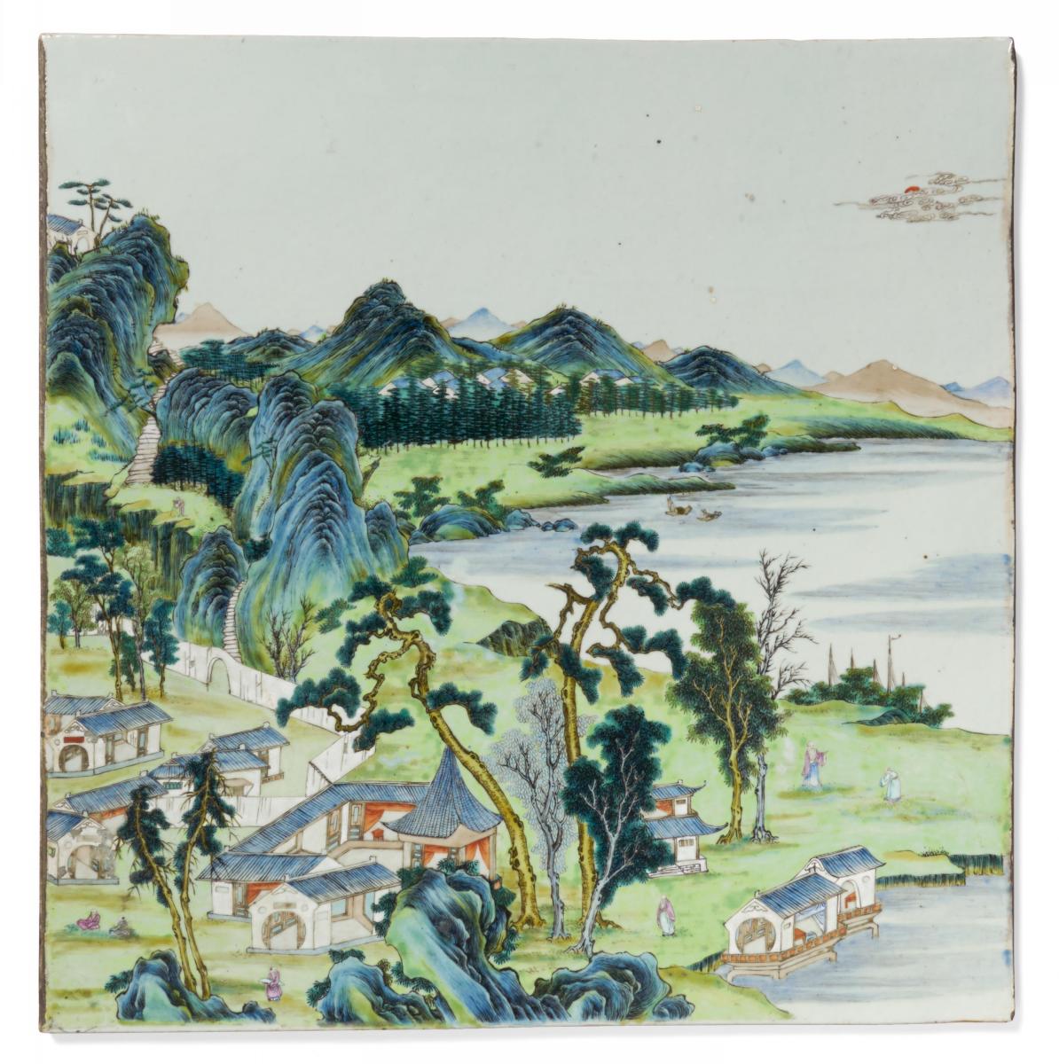GROßE PLATTE MIT IDYLLISCHER UFERLANDSCHAFT.