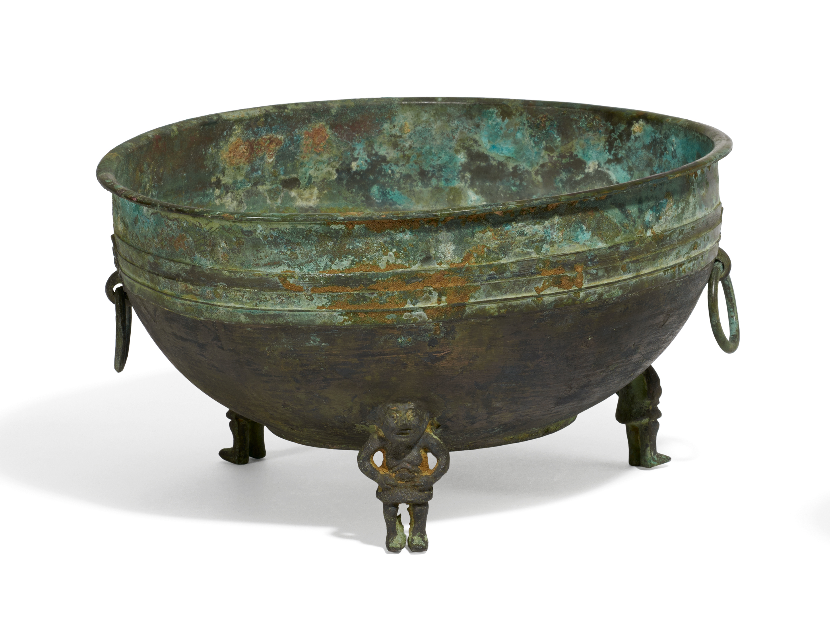 Beschreibung: Die halbkugelige Form steht auf drei anthropomorphen Figuren. Unter der dünnen, waagrechten Lippe ist ein dreiteiliges, flaches Reliefband aufgelegt, außerdem zwei Masken, welche Ringösen halten. Der abgeflachte Boden der Schale ist zusätzlich mit einem niedrigen Fußring versehen.