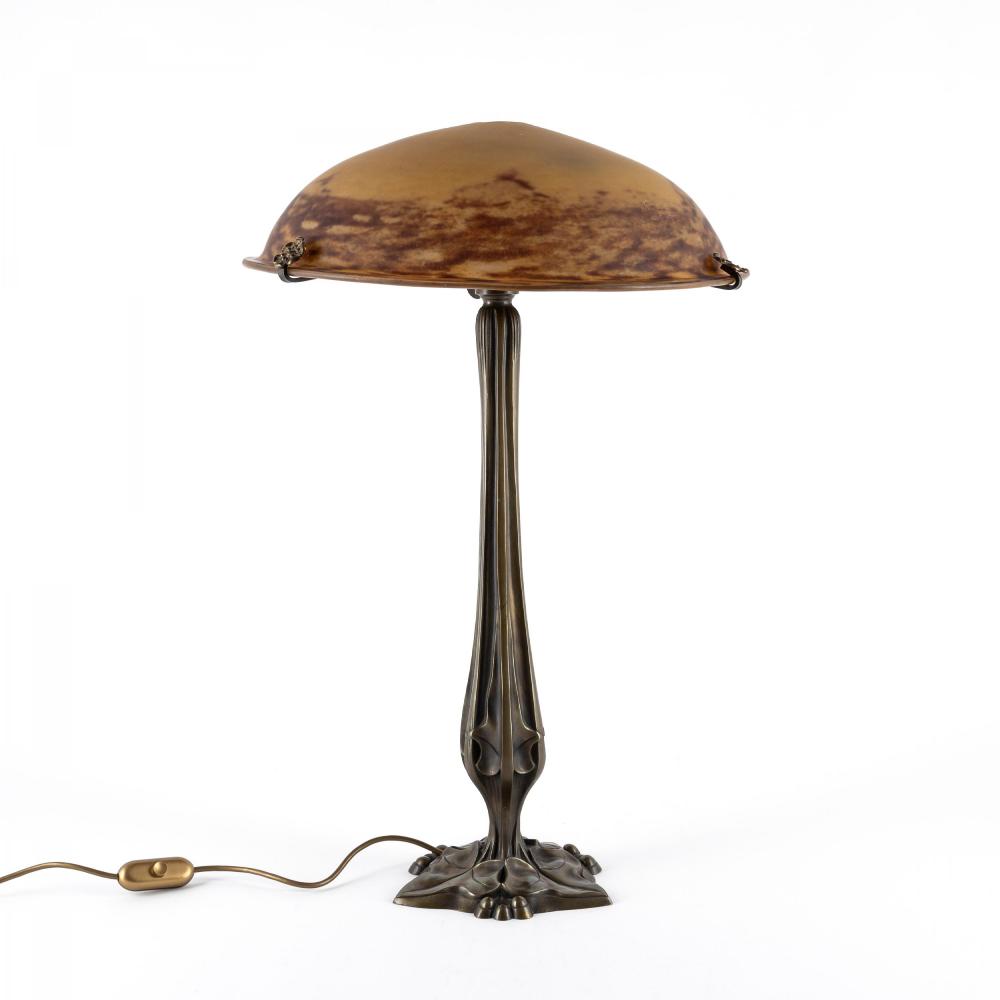 Der Lampenfuß in Blattornamentik. Der Lampenschirm schalenartig, flach und weit auskragend. .