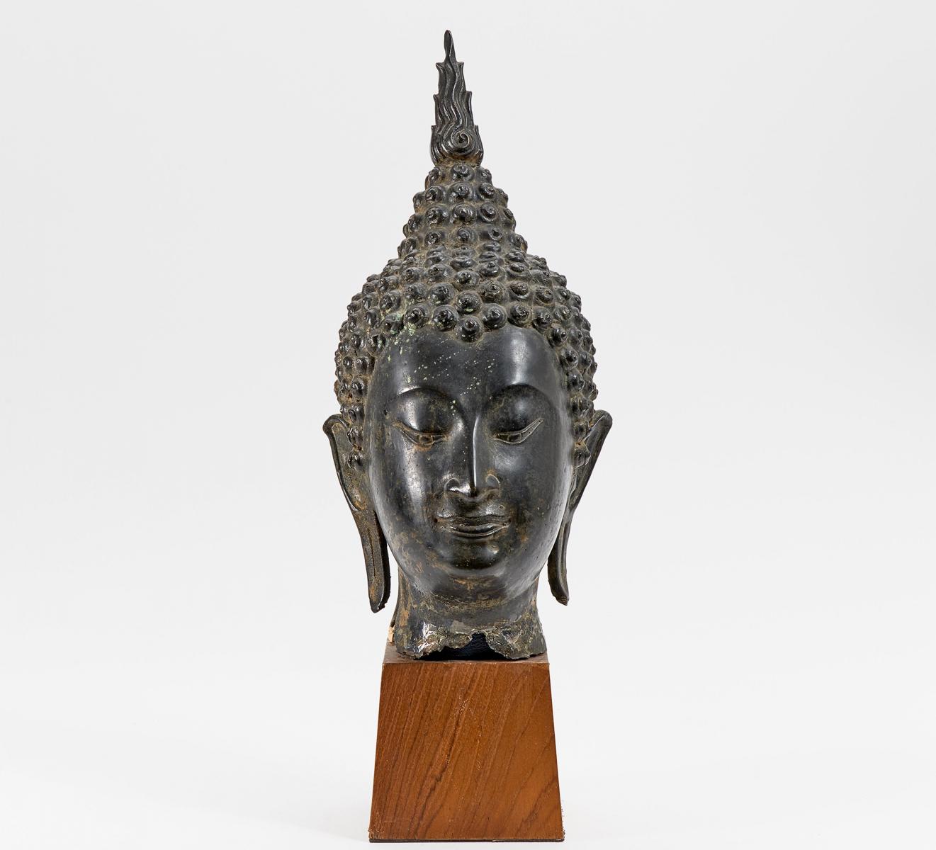 GROSSER BUDDHAKOPF MIT LOCKEN UND FLAMMENDER KETUMALA.