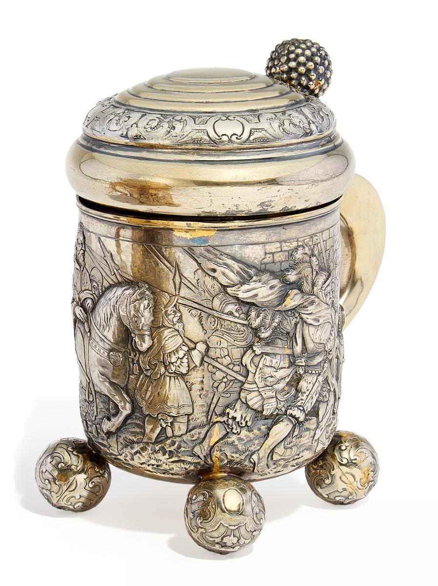 Silber mit Innenvergoldung. Auf vier großen Kugelfüßen zylindrischer Korpus mit umlaufend reliefierter, vielfiguriger