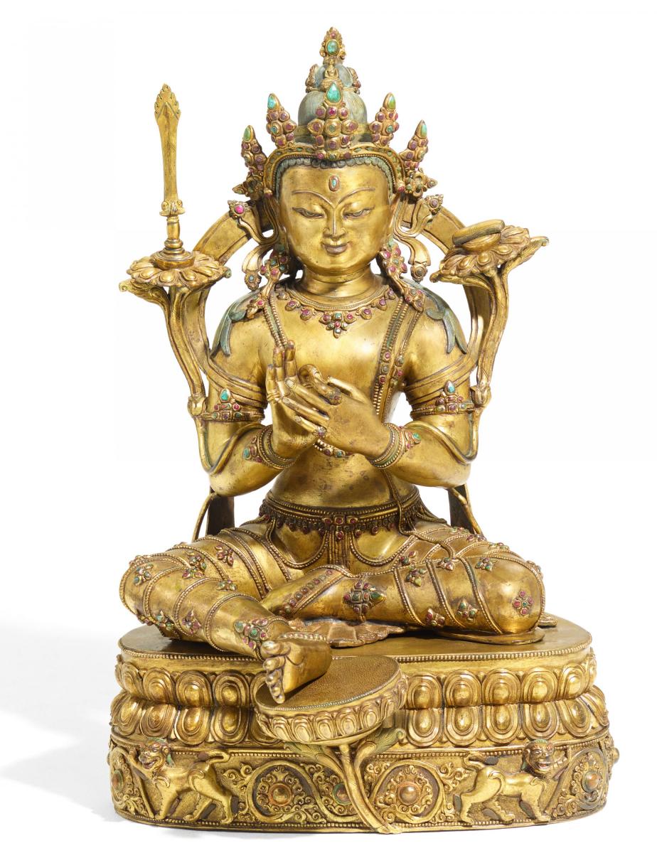 GROßER MANJUSHRI AUF DEM LOTOSTHRON MIT LÖWENSOCKEL.