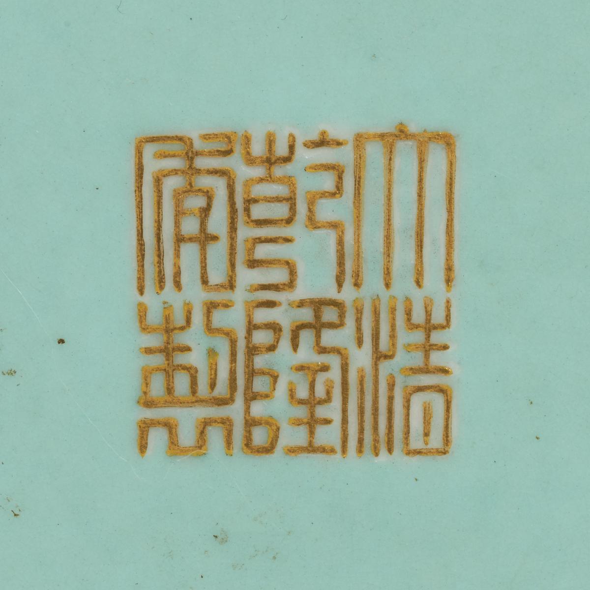 Technik: Porzellan, bemalt in famille rose und Gold auf türkisfarbenem Fond.