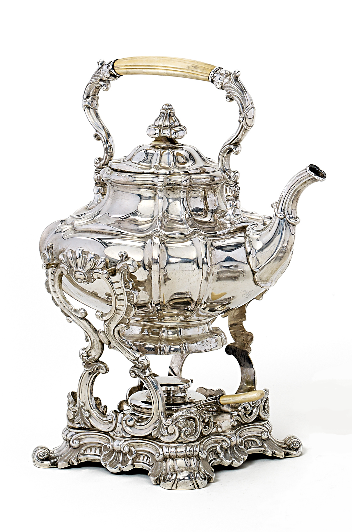 Silber. Beingriffe. Großer Rechaud mit Brenner. Reich reliefierte und punzierte Rocailleschwünge mit Muschel-