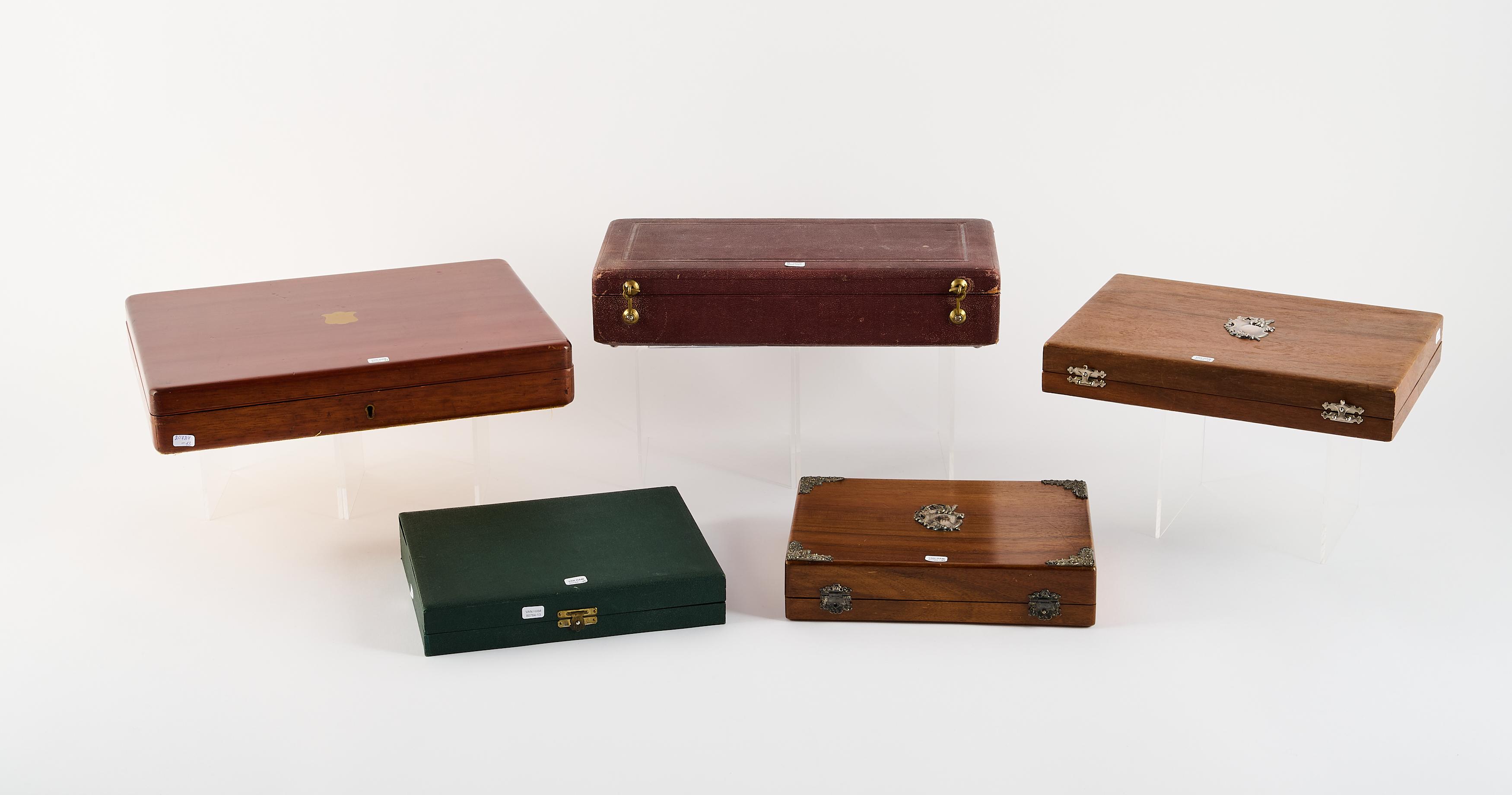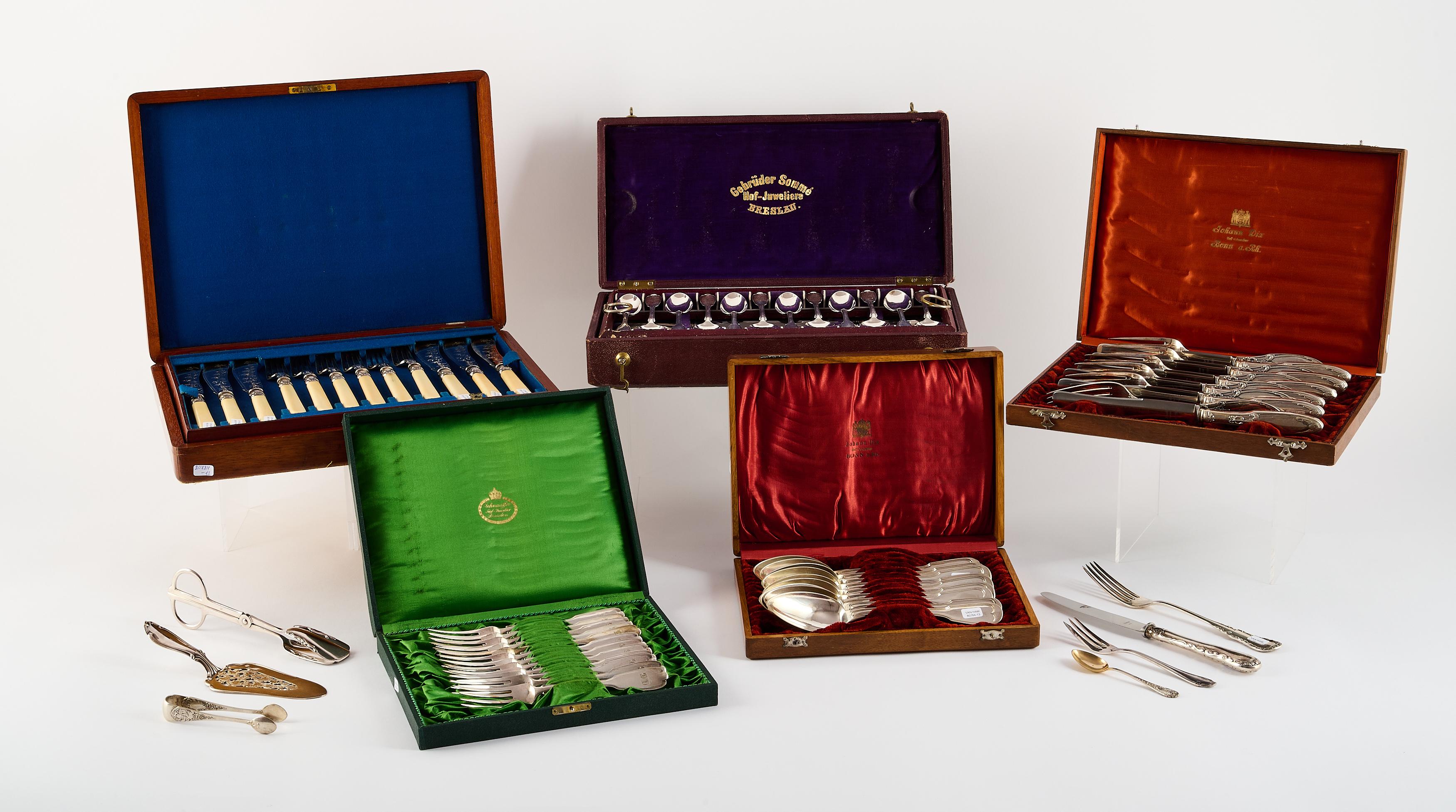 a) Satz von 12 Vorspeisengabeln in Schatulle. b) Satz von 12 Dessertmessern und 12 Kaffeelöffeln. c) Folge von 9 Menuelöffeln. d) Satz von 6 Messern und 6 Gabeln mit Festons. e) Satz von 4 Menuegabeln & 5 Menuemessern mit Rosen. f) 12 Mokkalöffeln & Zuckerzange. Beilage: 12 Kuchengabeln, 1 Kuchenheber, 1 Gebäckzange, Fischbesteck für 12 Personen. Metall versilbert. .