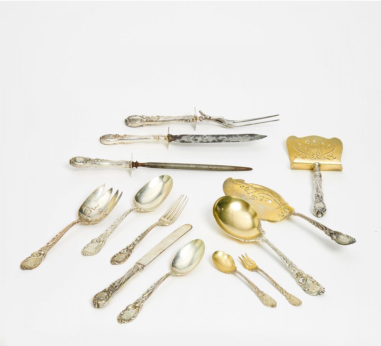 Beschreibung: Insg. 129 Teile, best. aus 12 Speisegabeln, 12 Speisemessern, 6 Speiselöffeln, 12