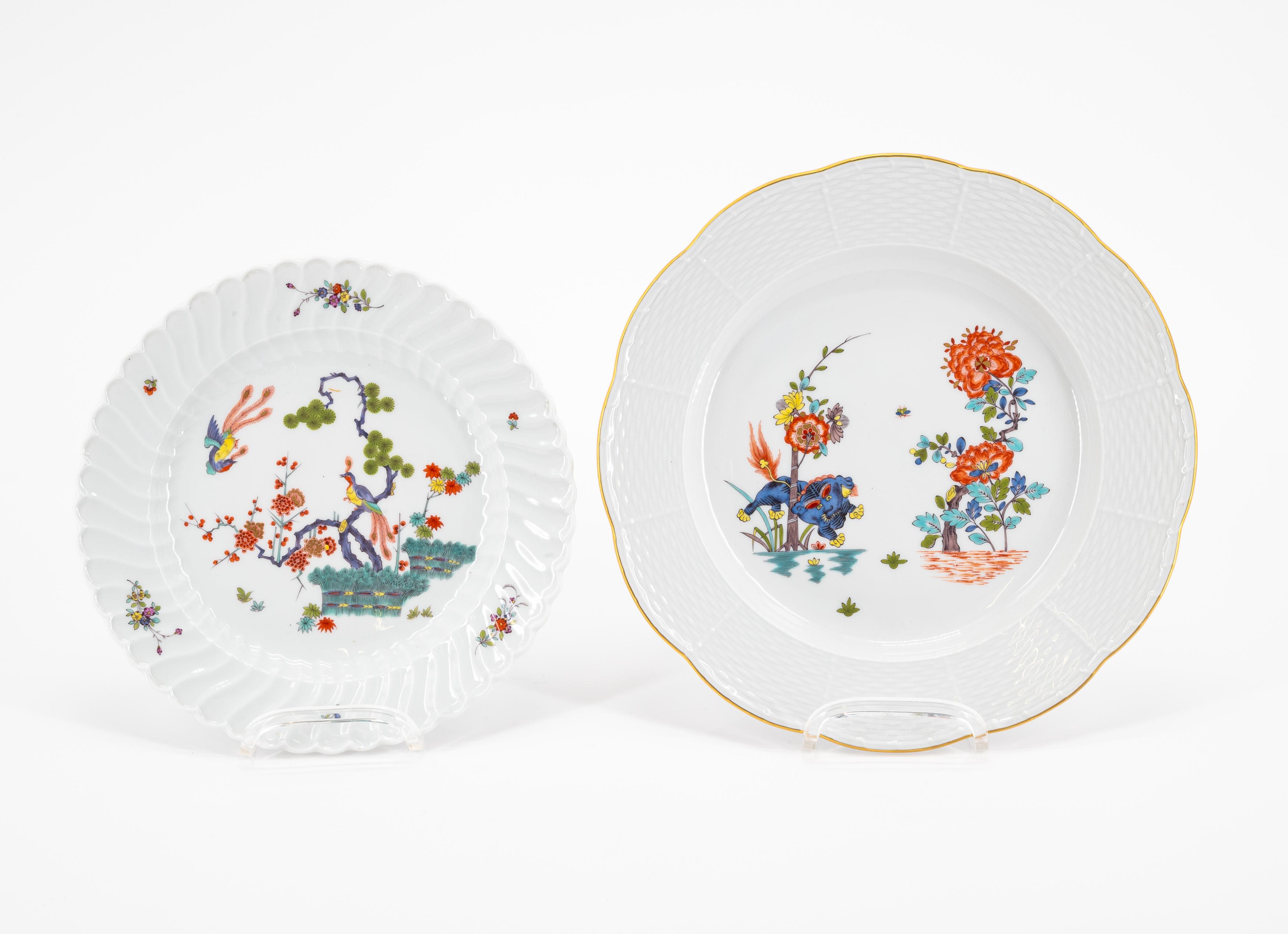 - Kännchen, Schale, 2 Kuchenteller, 1 Untertasse, 1 Nussschale Vogel-Fels-Dekor.
