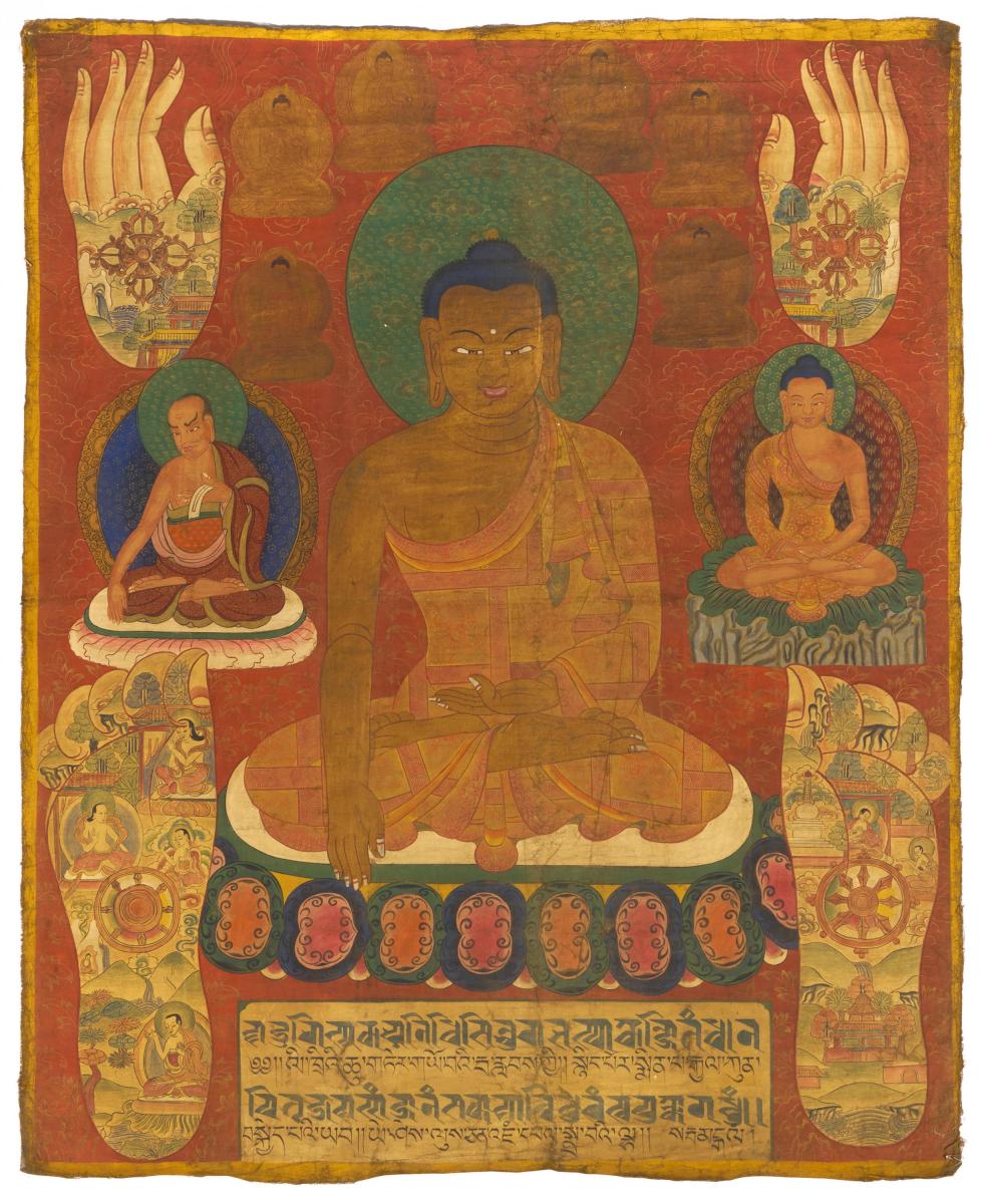 Beschreibung: Im Zentrum Shakyamuni in bhumisparsa mudra auf einem Lotosthron. Ihn flankieren ein Lama