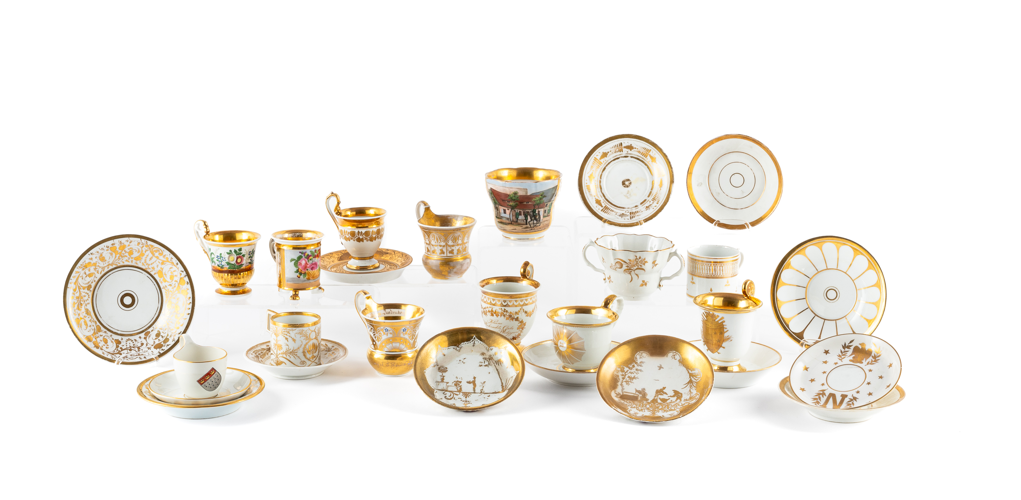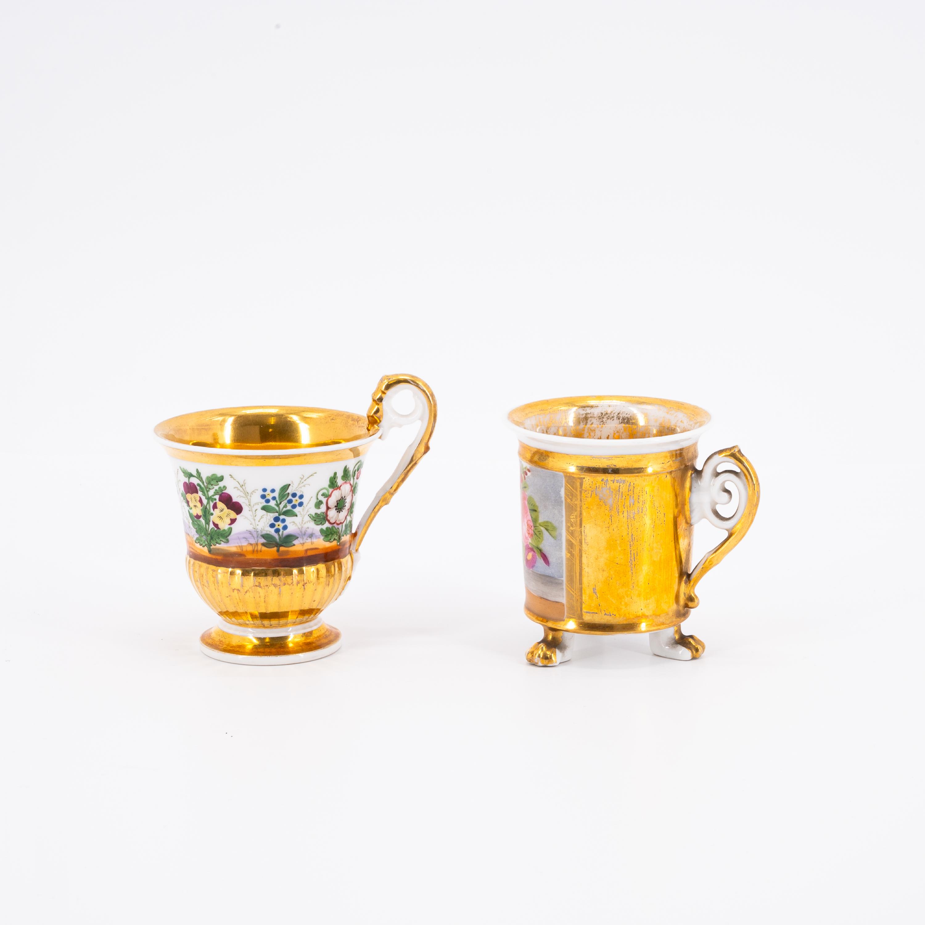 GRUPPE MIT TASSEN & UNTERTASSEN, 1 KUMME MIT VERSCHIEDENEN GOLDDEKOREN.