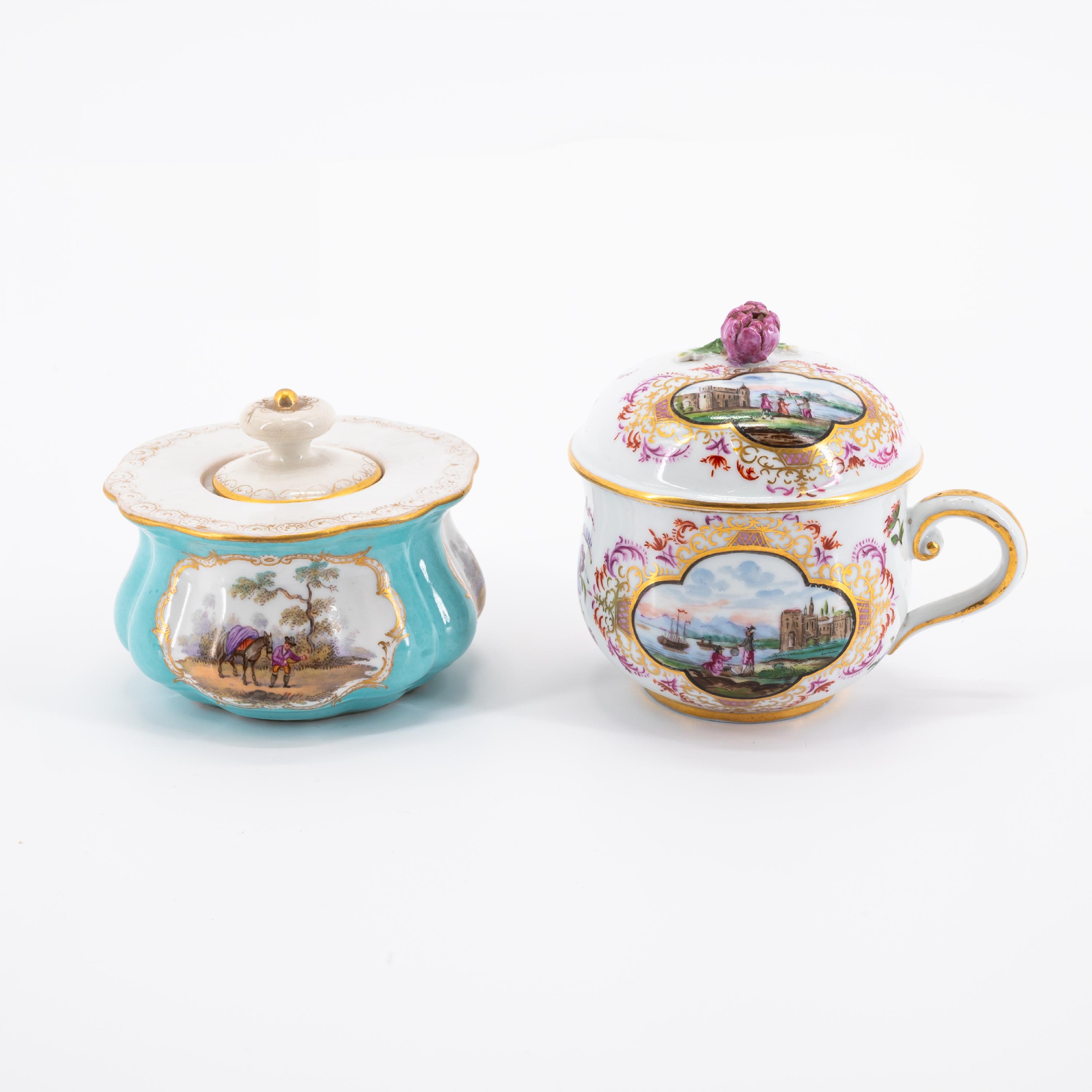 Beschreibung: Bestehend aus: Duftei mit galanten Szenen, Cremetöpfchen und Tintenfäßchen, Dose, Milchkännchen und Zuckerdose mit bäuerlichen Szenen, Deckelschälchen mit Vogelknauf,