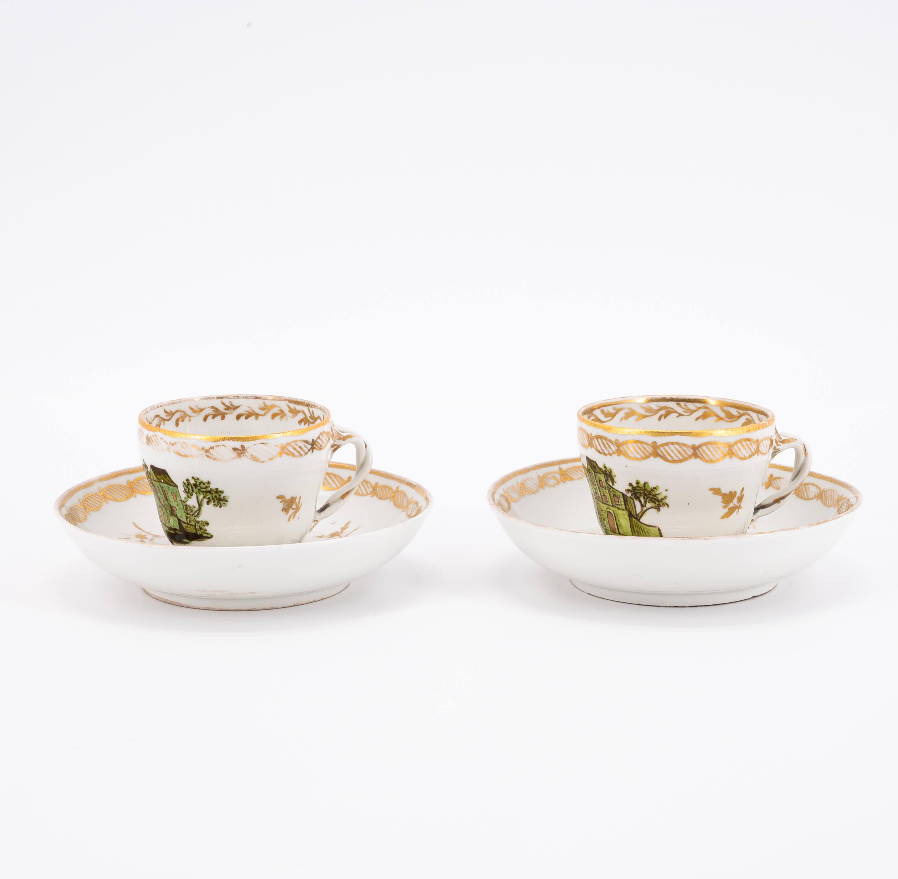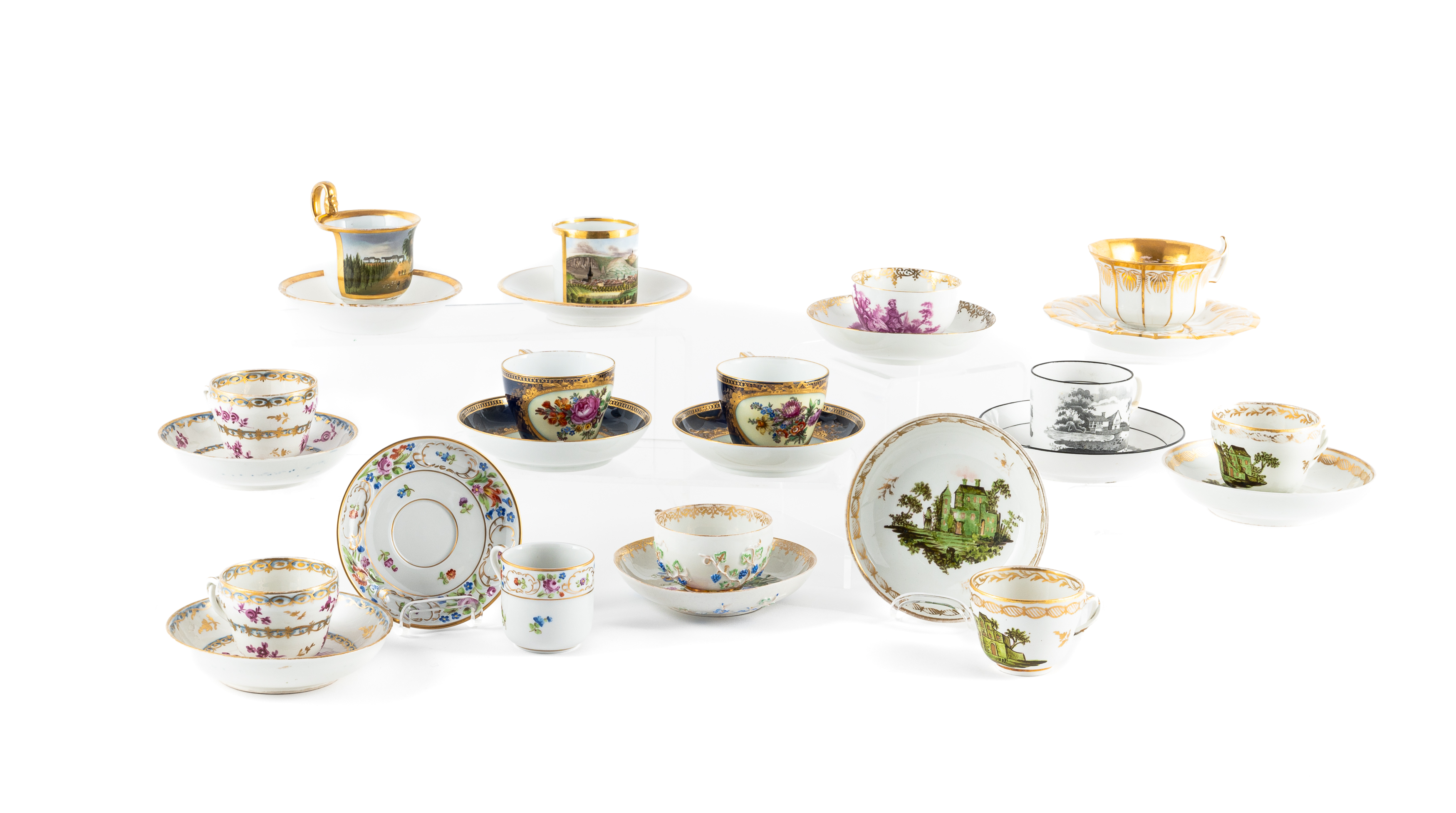 GRUPPE VON 13 UNTERSCHIEDLICH DEKORIERTEN TASSEN MIT PASSENDEN UNTERTASSEN.