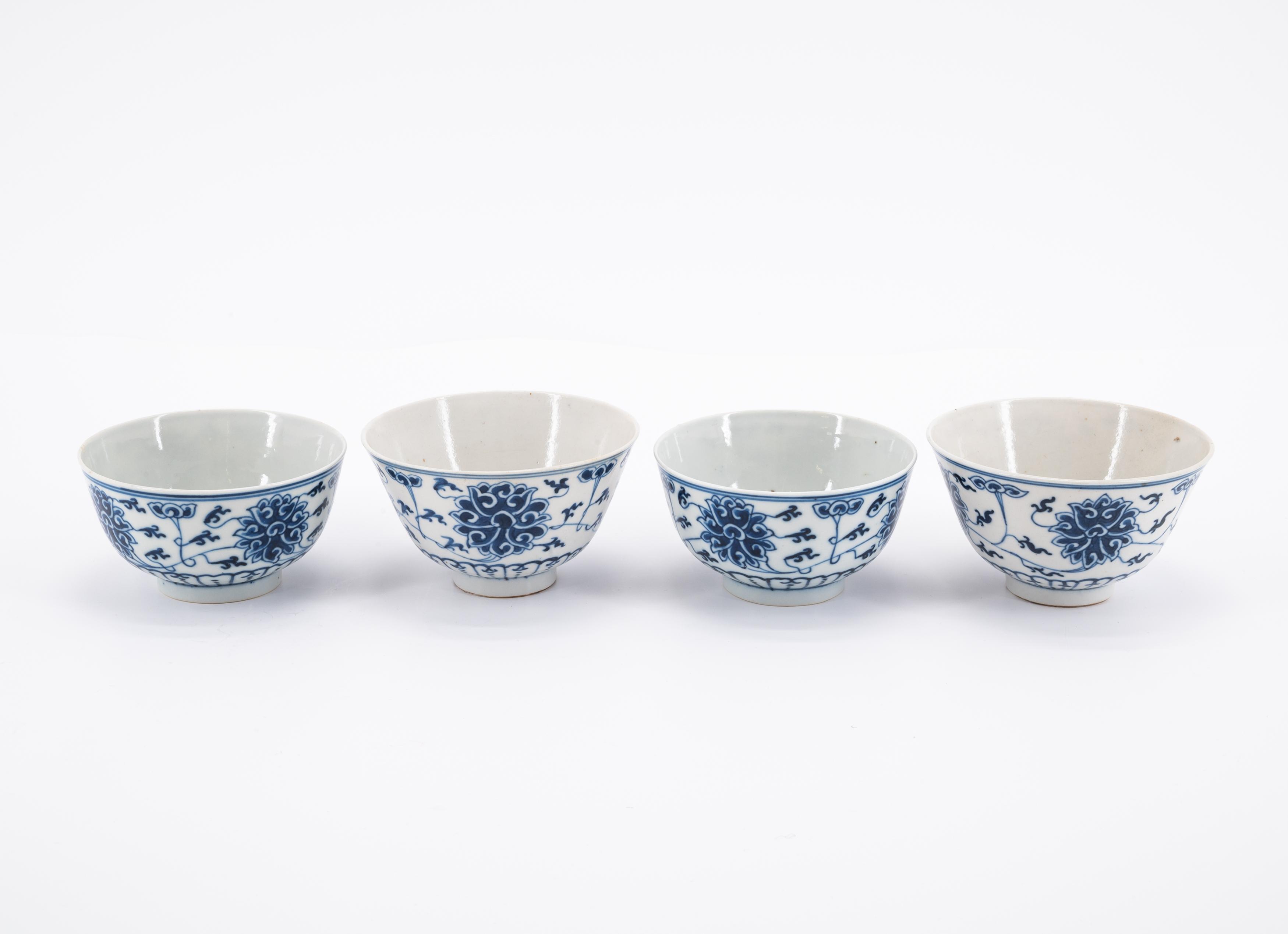 Beschreibung: Circa 60 Teile mit blau-weißen, stilisierten Chrysanthemenblueten zwischen Blattranken. Verschiedene Formen und Dekore.