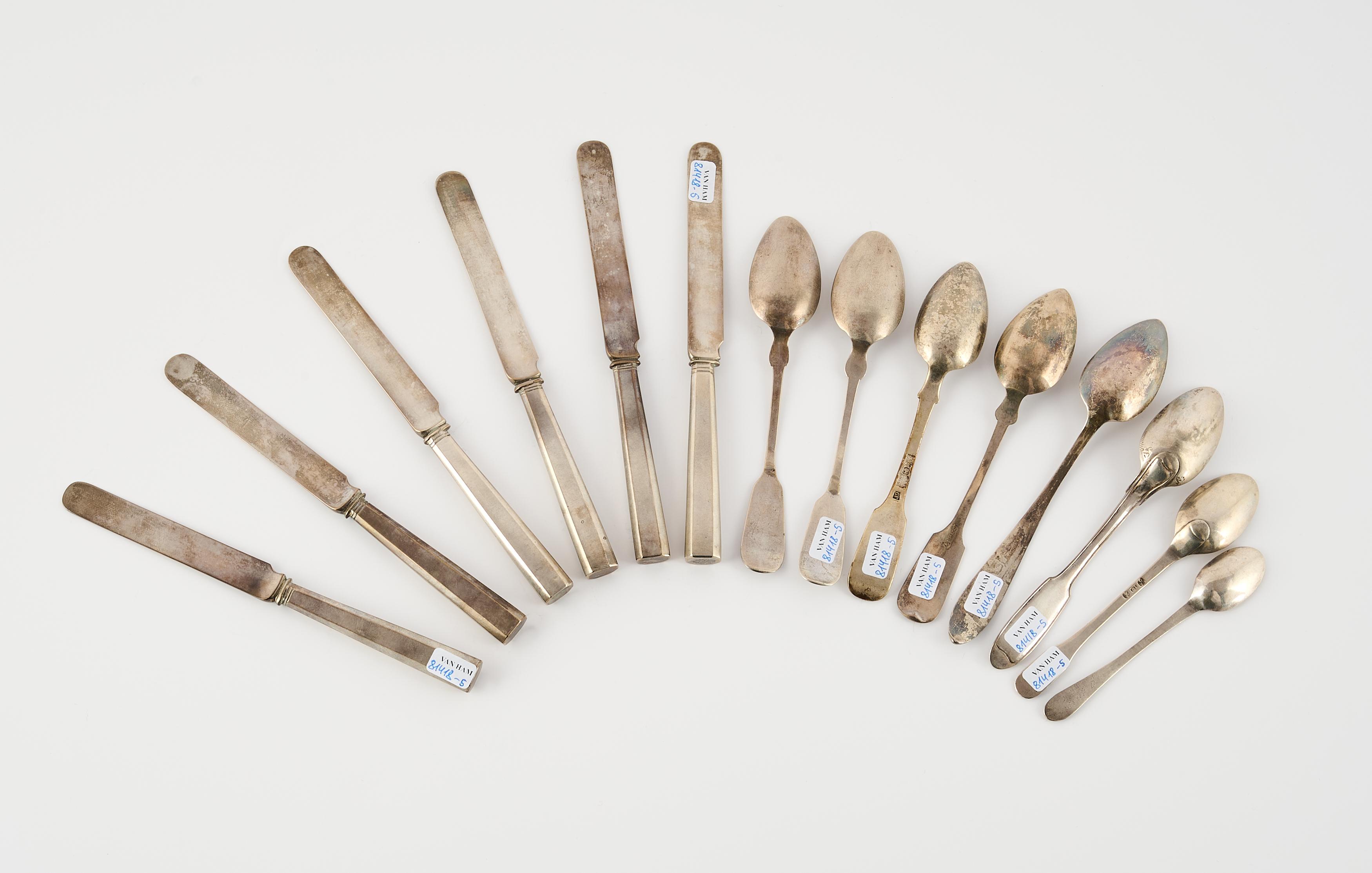 GRUPPE VON ACHT VERSCHIEDENEN KAFFEELÖFFELN & EIN SATZ MIT SECHS OBSTMESSERN