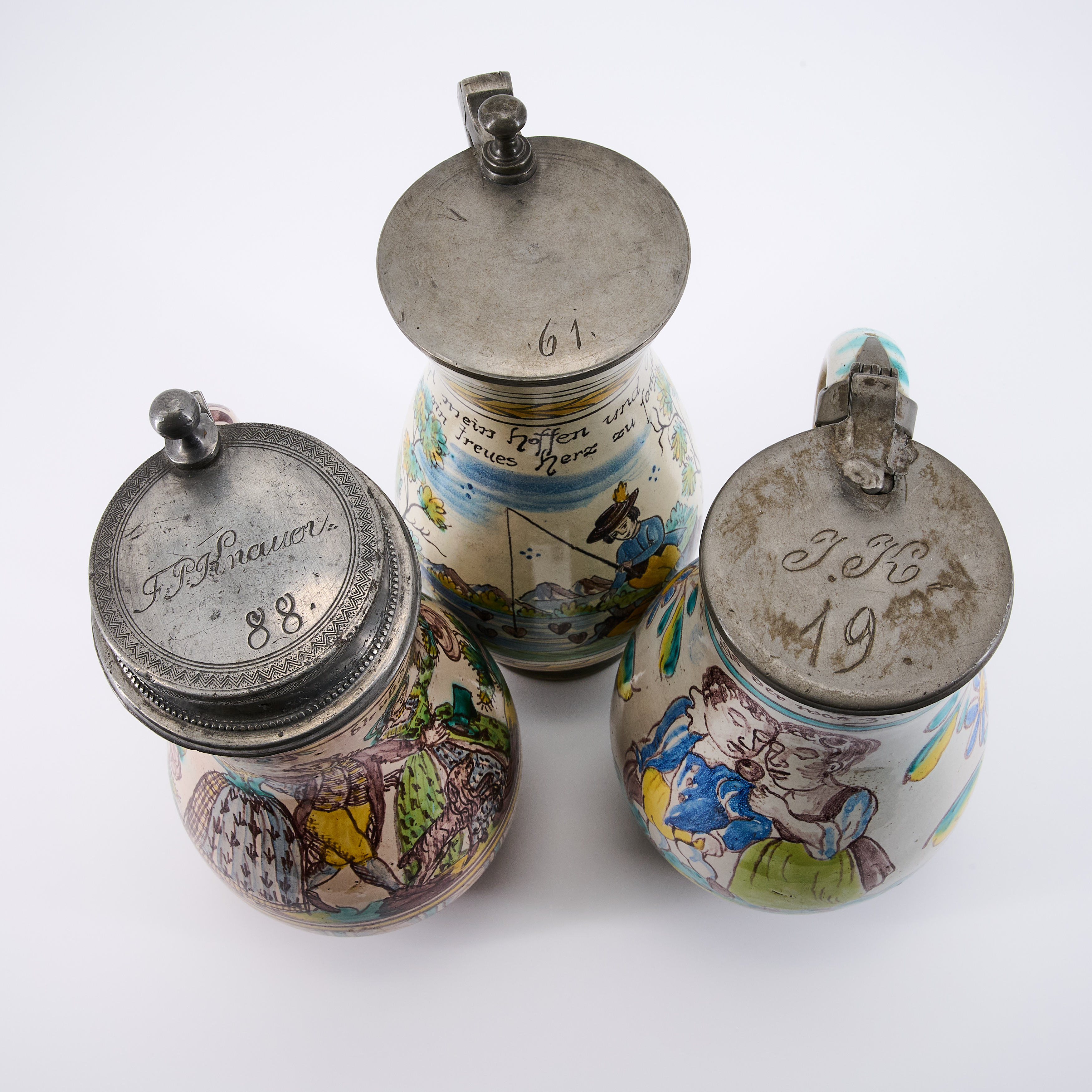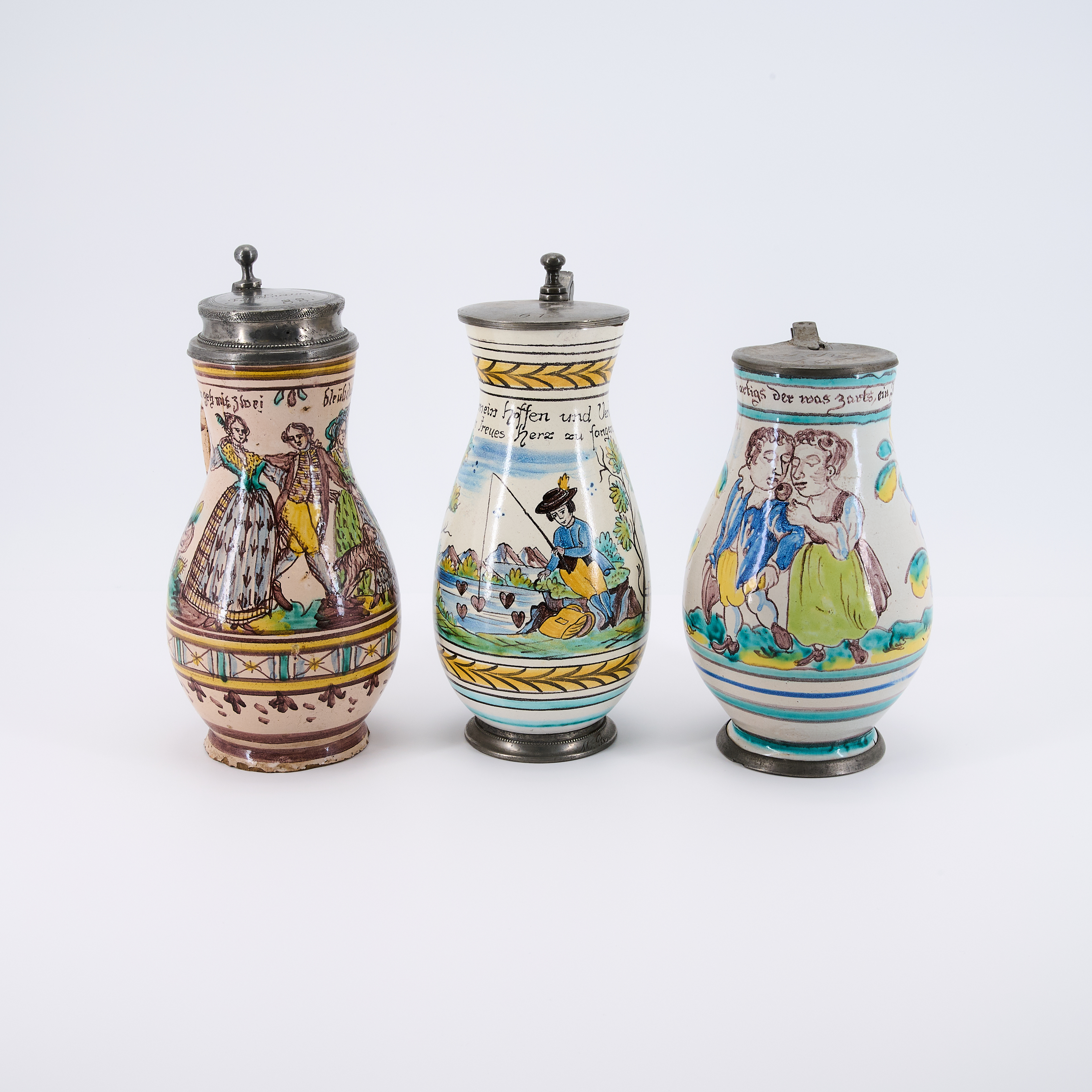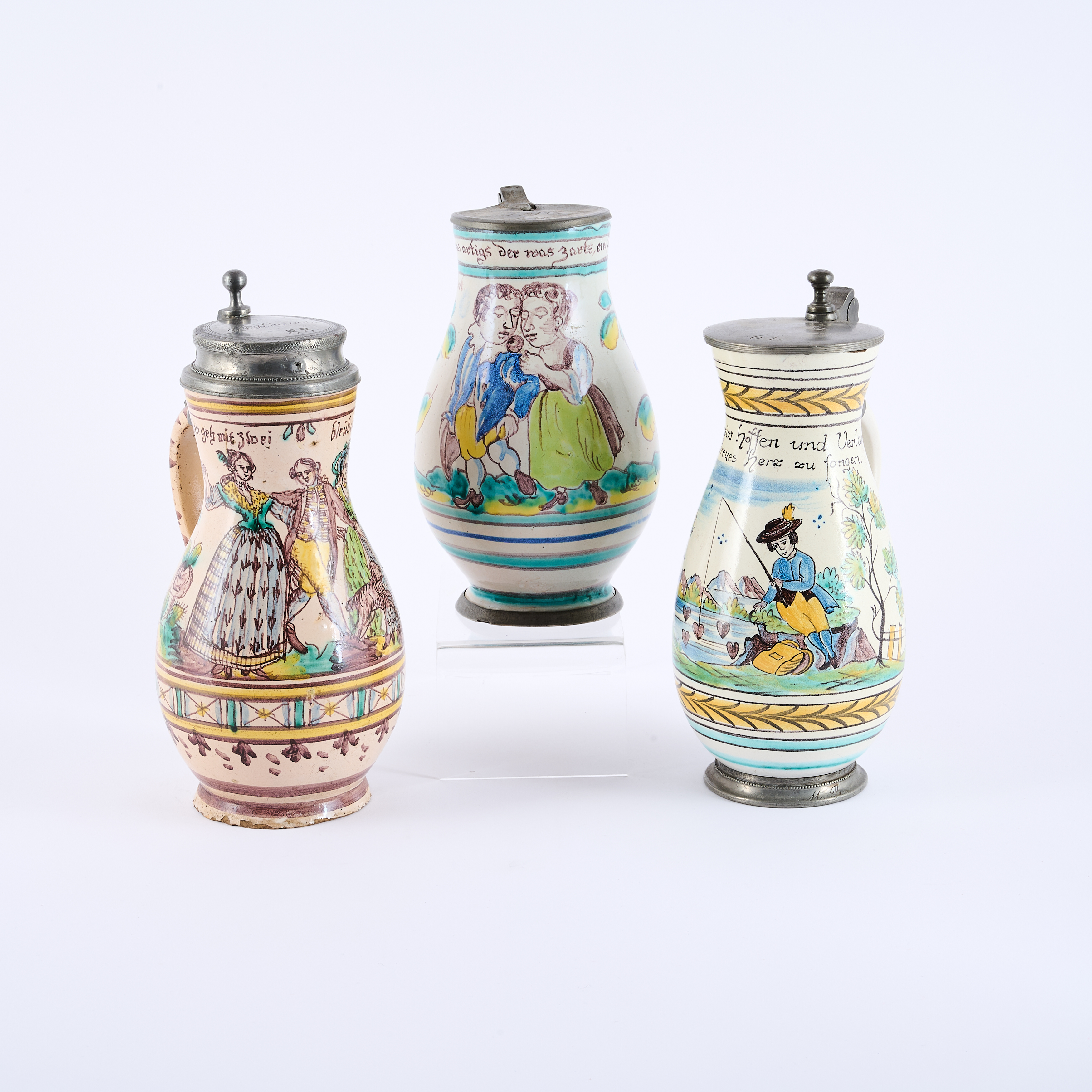GRUPPE VON DREI BIRNKRÜGEN MIT LIEBESMOTIVEN UND -SPRÜCHEN