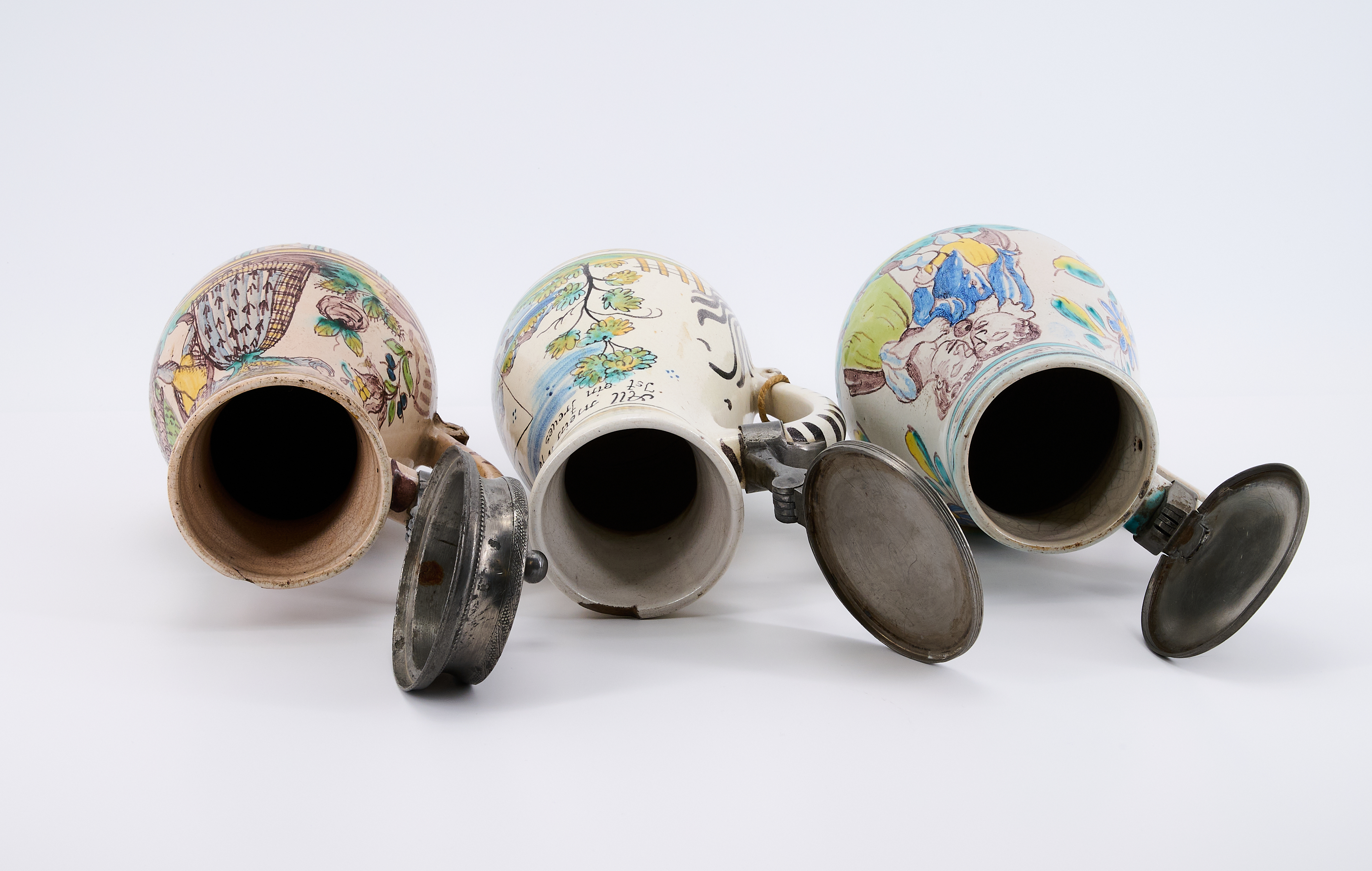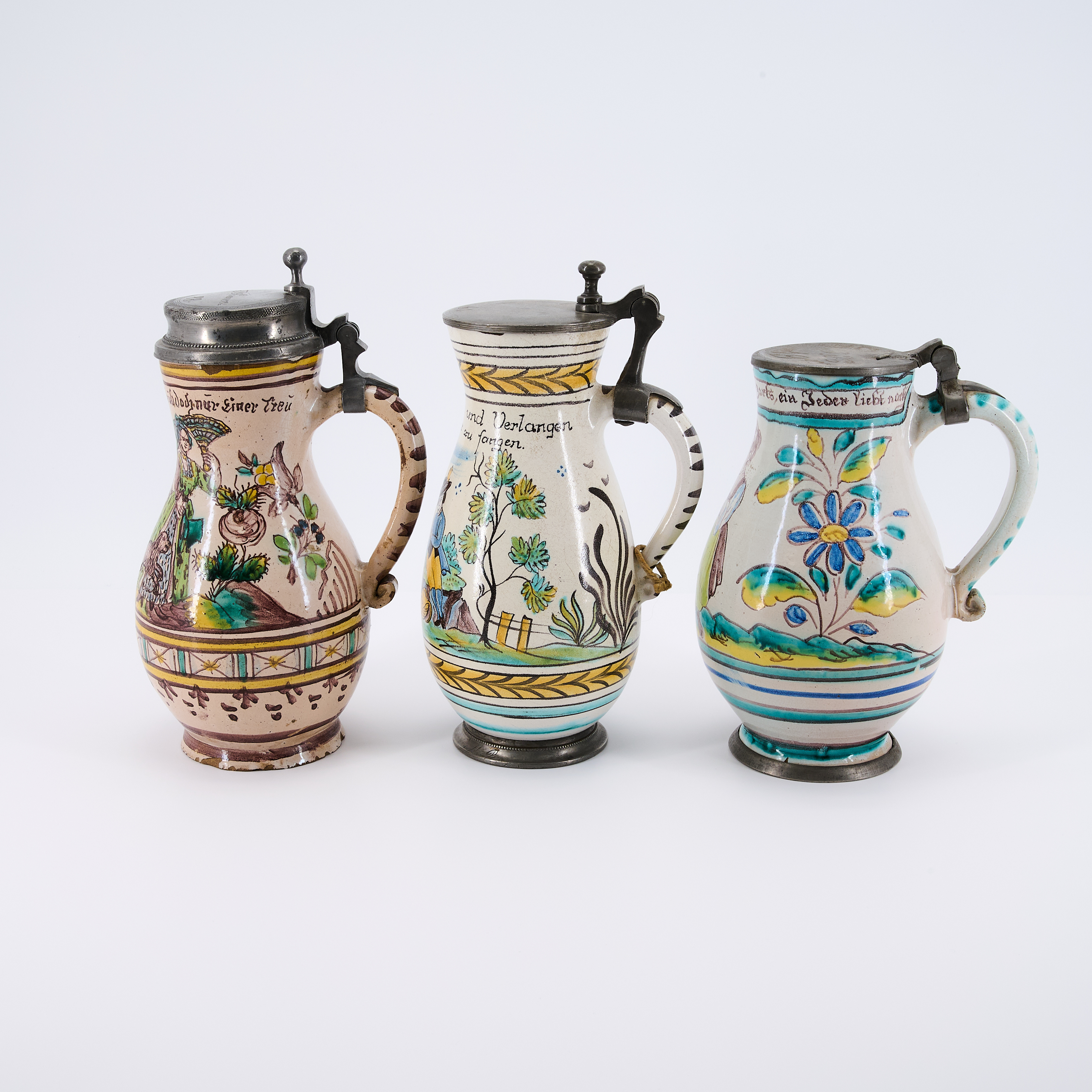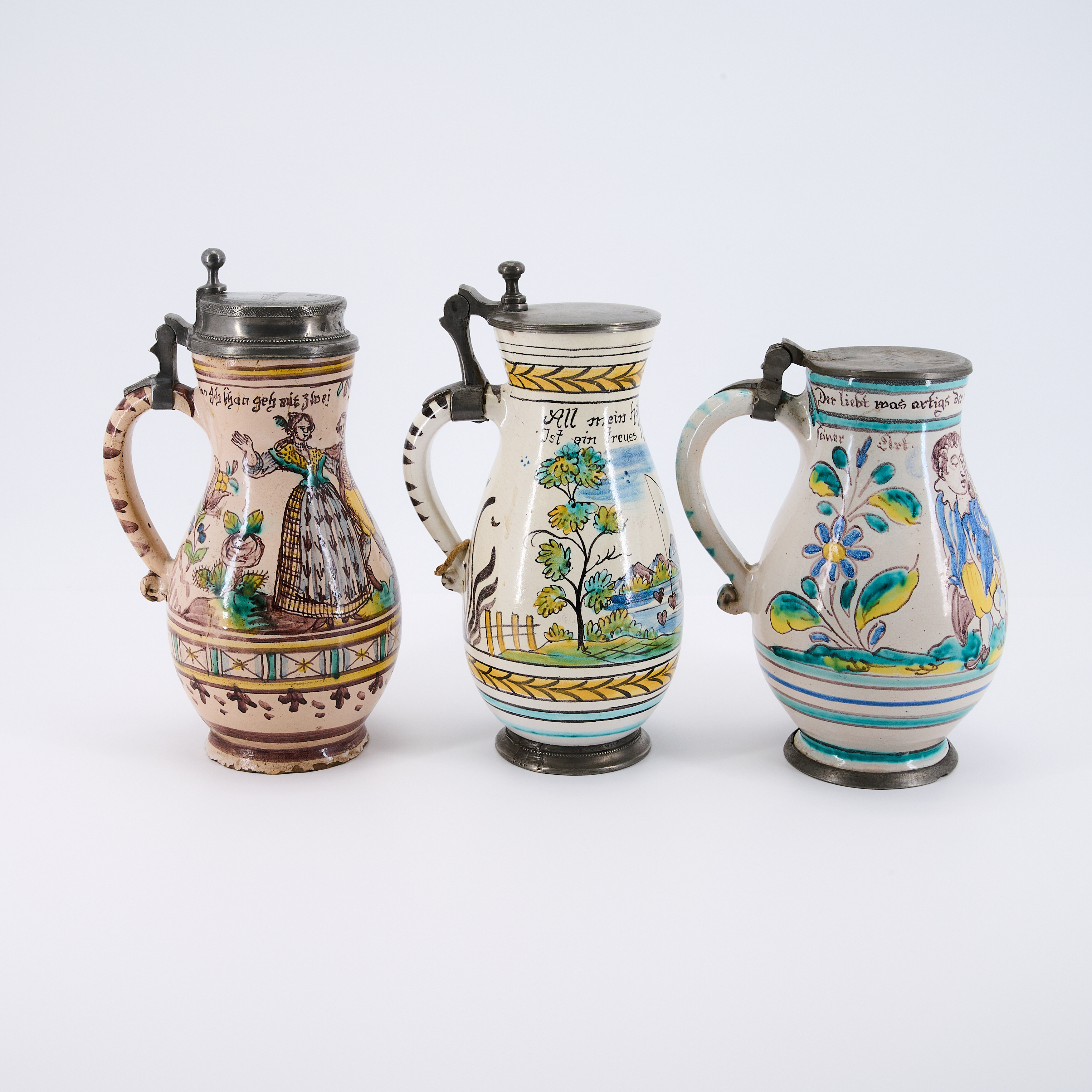 GRUPPE VON DREI BIRNKRÜGEN MIT LIEBESMOTIVEN UND -SPRÜCHEN