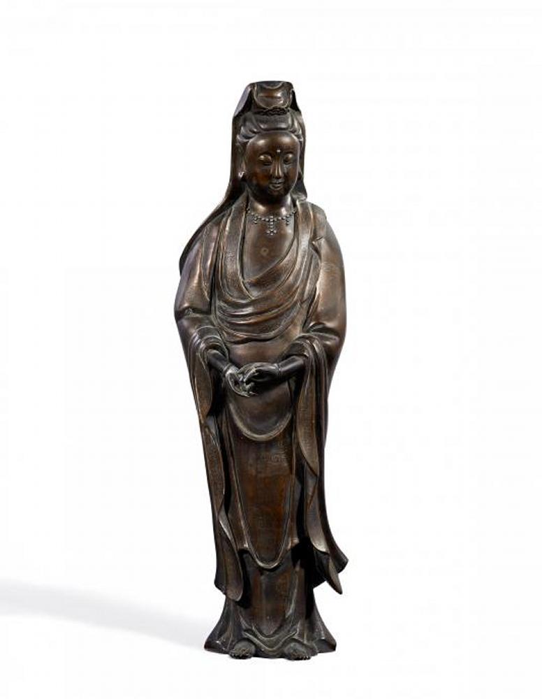Technik: Bronze mit Silbereinlagen, dunkler Patina und Resten von schwarzem Lack.