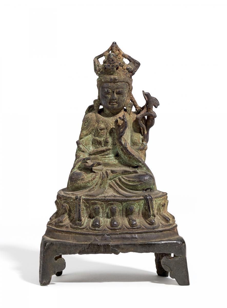 Beschreibung: Sitzend auf einem Lotosthron auf einem hohen Tisch mit vier Beinen mit Voluten. Auf der