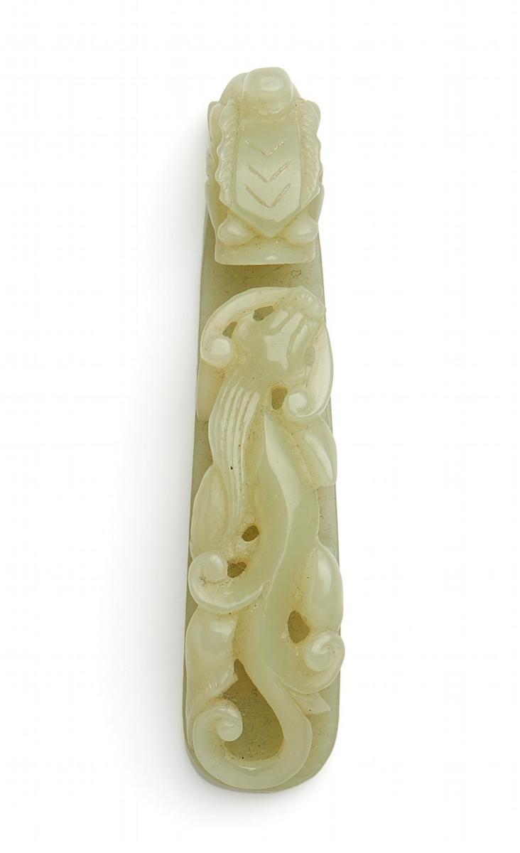 Beschreibung: Das Hakenende mit einem Drachenkopf, der qilong gegenüber komplett unterschnitten.