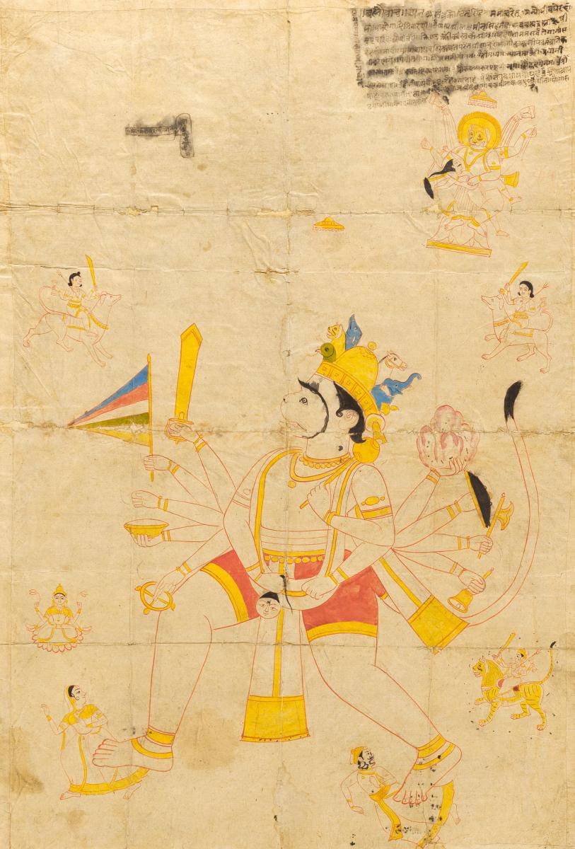 Beschreibung: a) Der zwölfarmige Hanuman. 63x44cm. b) Großes Sri-Yantra. 67x67cm. c) Zwei