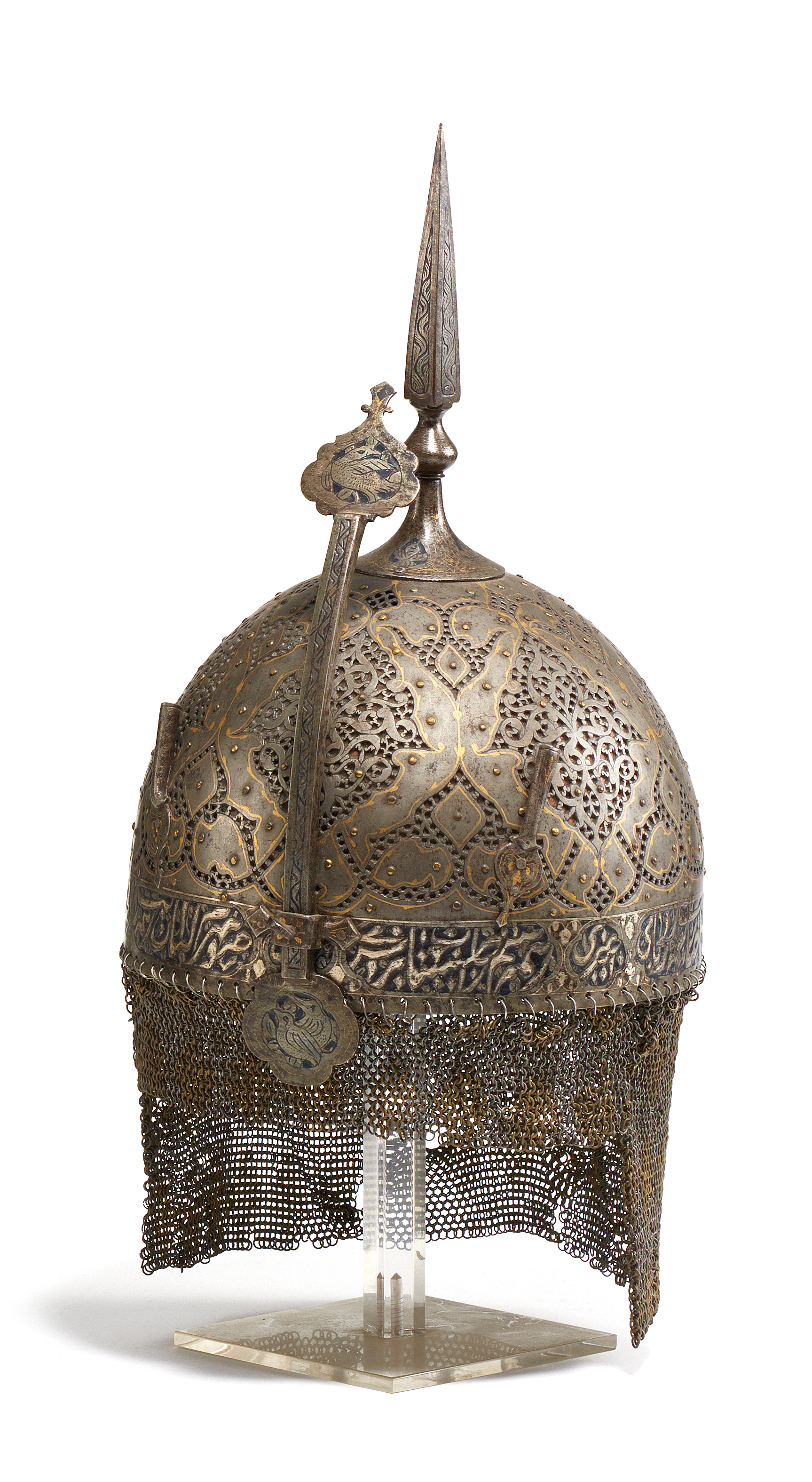 Technik: Eisen mit Gold- und Silbereinlagen (koftgari), feinste Durchbrucharbeit, hinterlegt mit Kupferfolie. Nackenschutz in zweifarbigem Kettgeflecht (zirah).