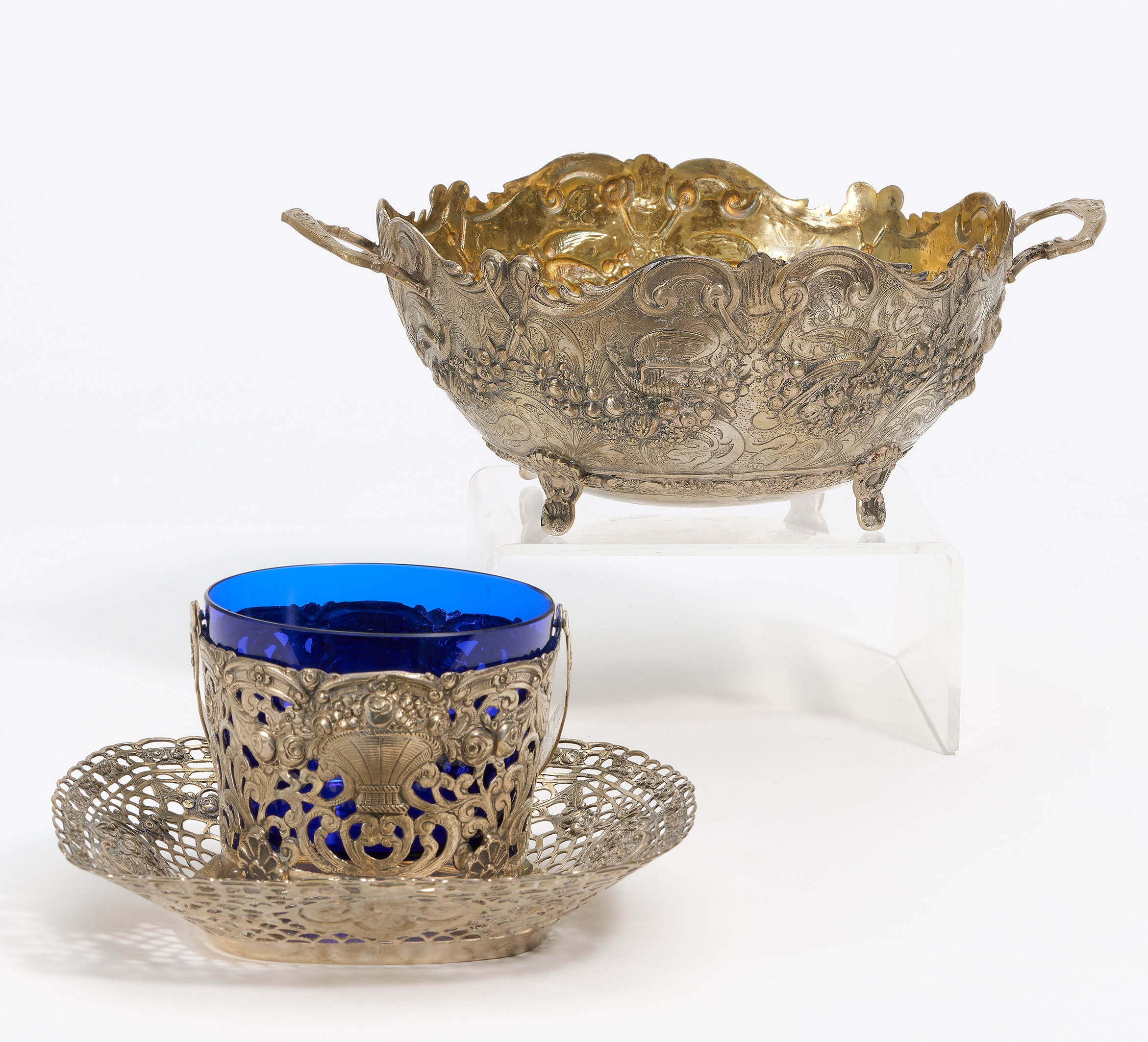 Zustand B. Beilage: Durchbrochen gearbeiteter Henkelkorb aus Silber auf durchbrochen gearbeitetem Untersetzer mit Rosendekor. Blauer Glaseinsatz.