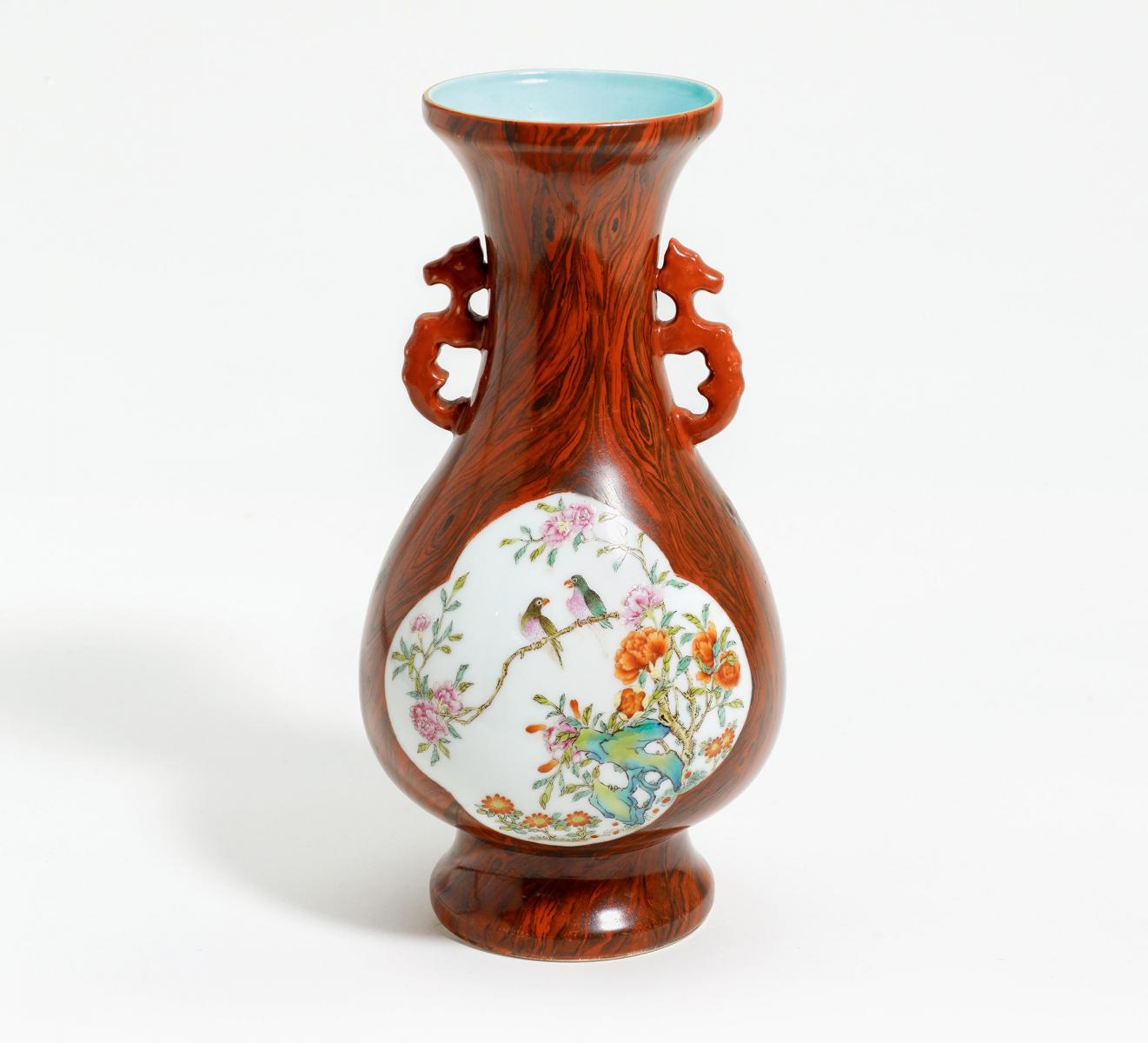 Technik: Porzellan famille rose mit bräunlichem Rot. Innen und am Boden Türkis glasiert.