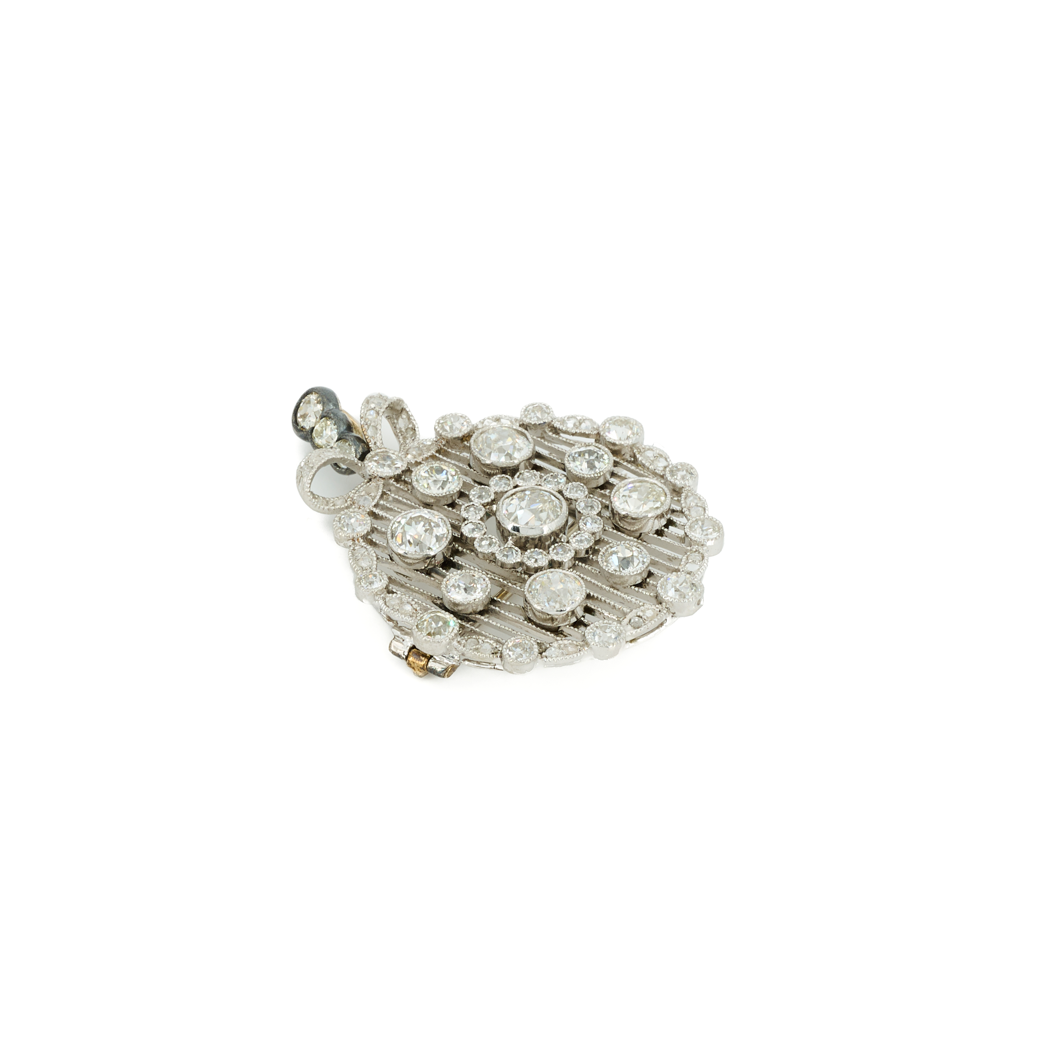 Beschreibung: Zarte Brosche aus Platin mit Diamantbesatz. Das Schleifendetail sowie die feinen Stege sind typisch für die technischen Neuerungen durch die Verwendung von Platin und für die Formsprache der Belle Époque. Solche Entwürfe werden aufgrund ihrer Filigranität als „dessins dentelles“ (französisch für Spitze) bezeichnet. Kann als Brosche oder dank der nachträglichen, beweglichen Öse als Anhänger getragen werden.