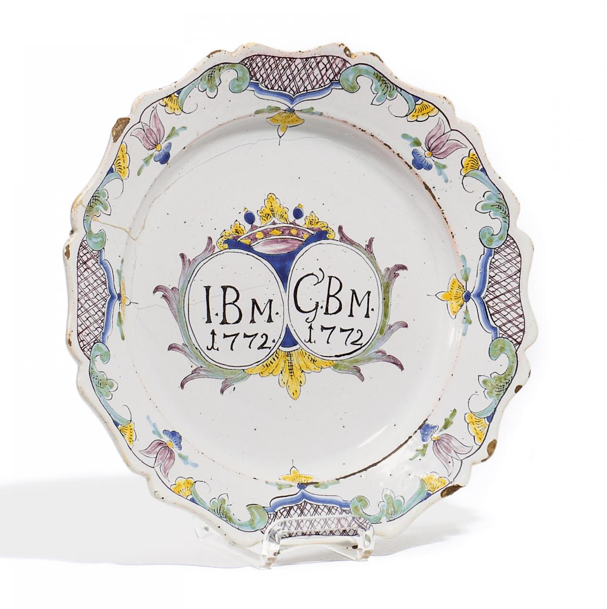 Beiger Scherben mit weißer Glasur und vorwiegend pastellfarbenem Dekor mit dunklen Konturen. Auf dem Spiegel Allianzkartusche mit Monogrammen I.BM. und G.BM., jeweils mit Jahreszahl