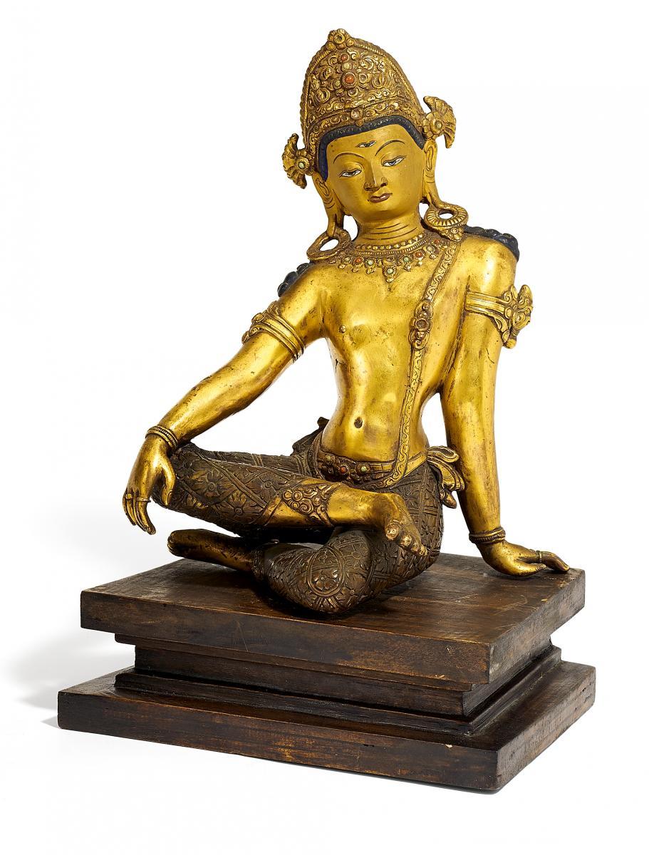 Technik: Schwere Kupferbronze reich graviert und partiell feuervergoldet, mit kultischer Bemalung und Steinbesatz.