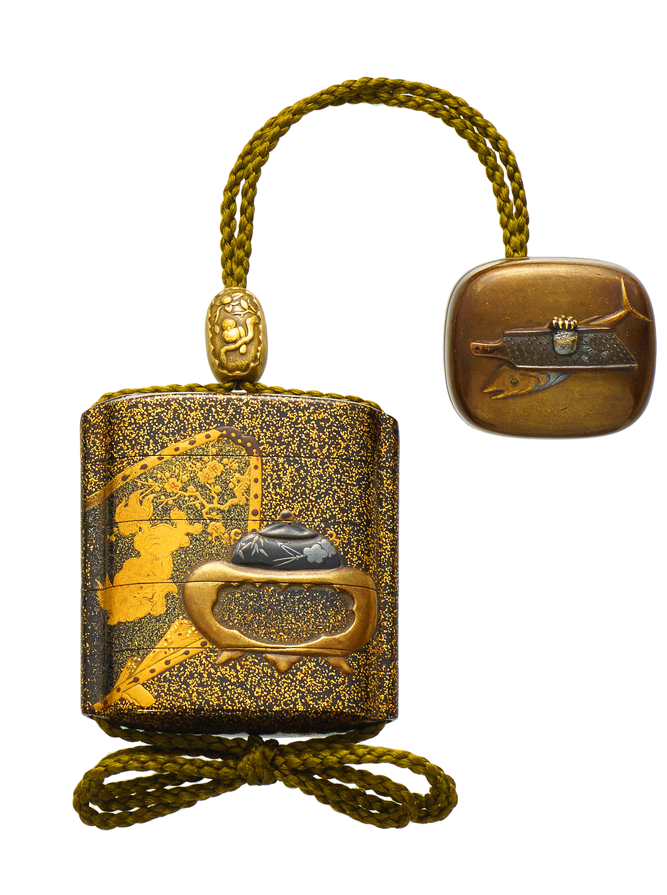 Siegel: Manjû-netsuke: Getrockneter Fisch mit Daikonreibe. Goldlack mit Einlagen aus Gold, Silber und Kupfer. B. 3,5cm. Sign.: Shinsai & Siegel. Ojime: Vogel und Blumen. Kupfer vergoldet. H. 1,8cm.