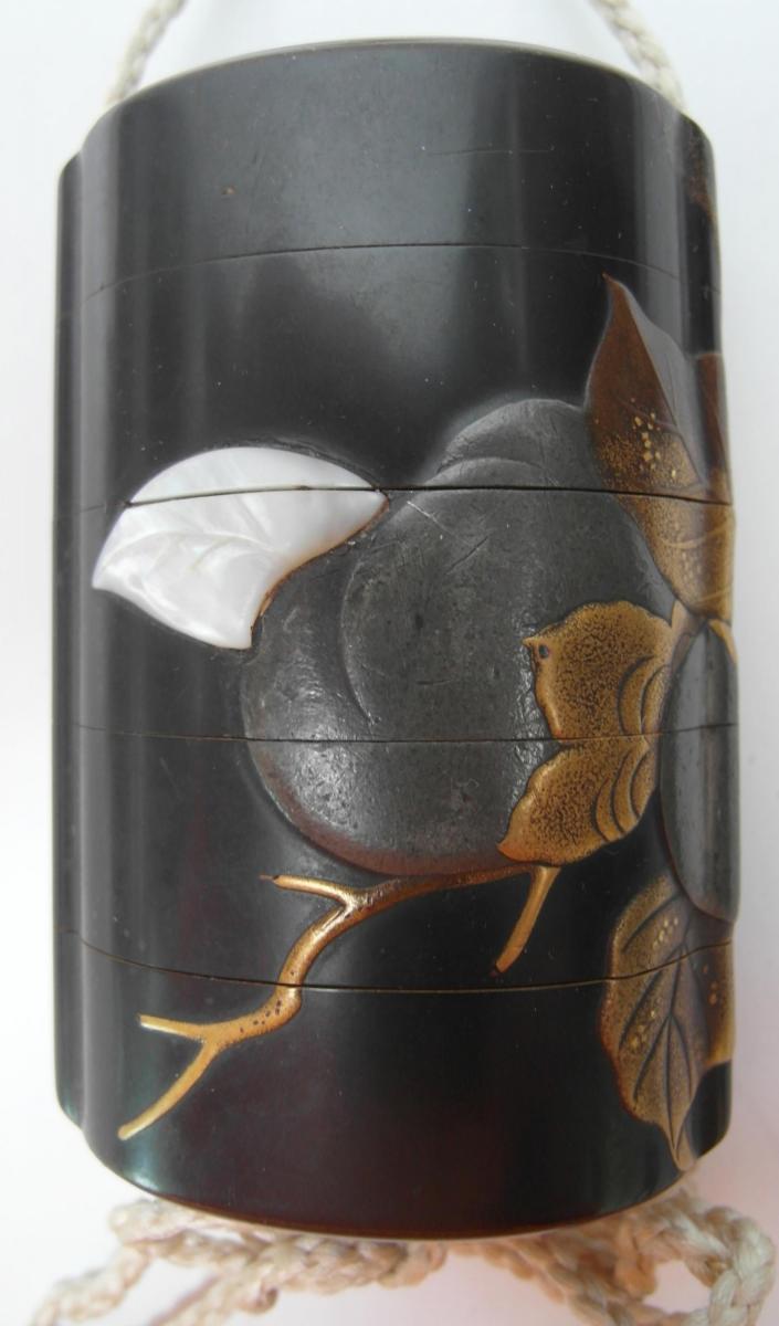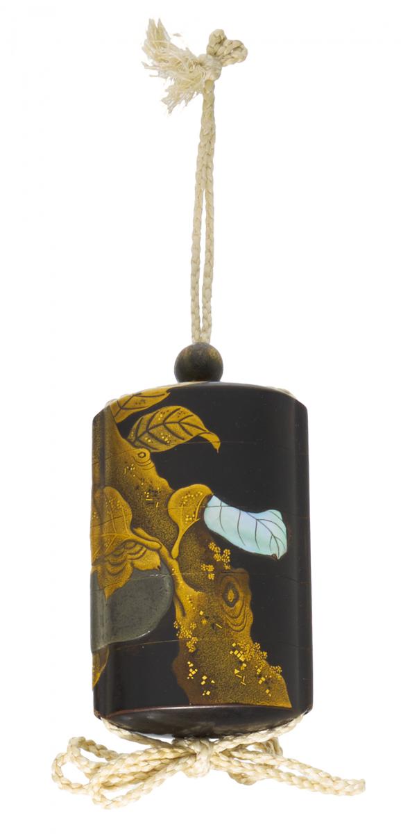 Beschreibung: Fünfteilig mit abgesetzter Schnurführung, jô und ge gewölbt. Holzperle als ojime.