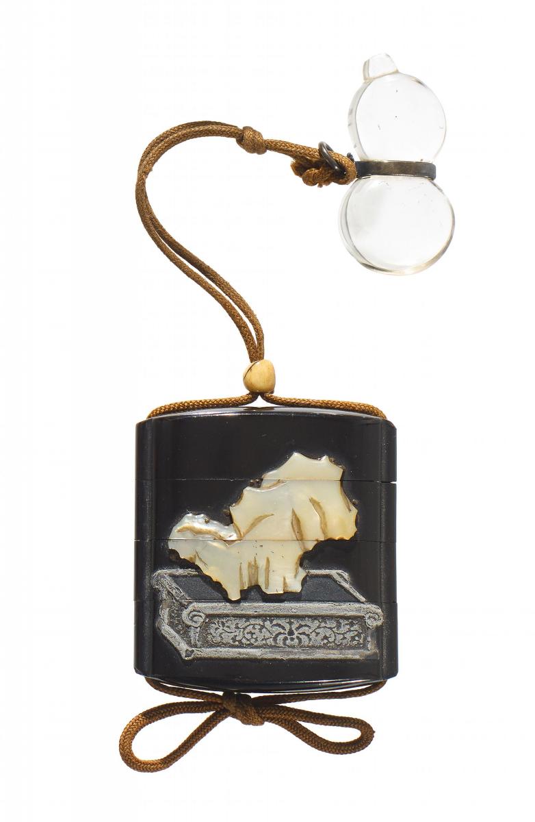 Technik: Fünfteilige mit abgesetzter Schnurführung. Schwarzlack (roiro) mit Einlagen aus Zinn und Perlmutt. Innen Rotlack.