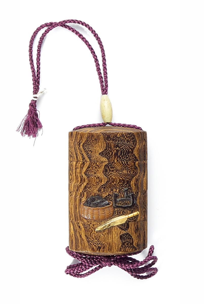 Beschreibung: Vierteilig, jô und ge in Somada-Manier. Das recht flache Inrô zeigt auf der Vorderseite