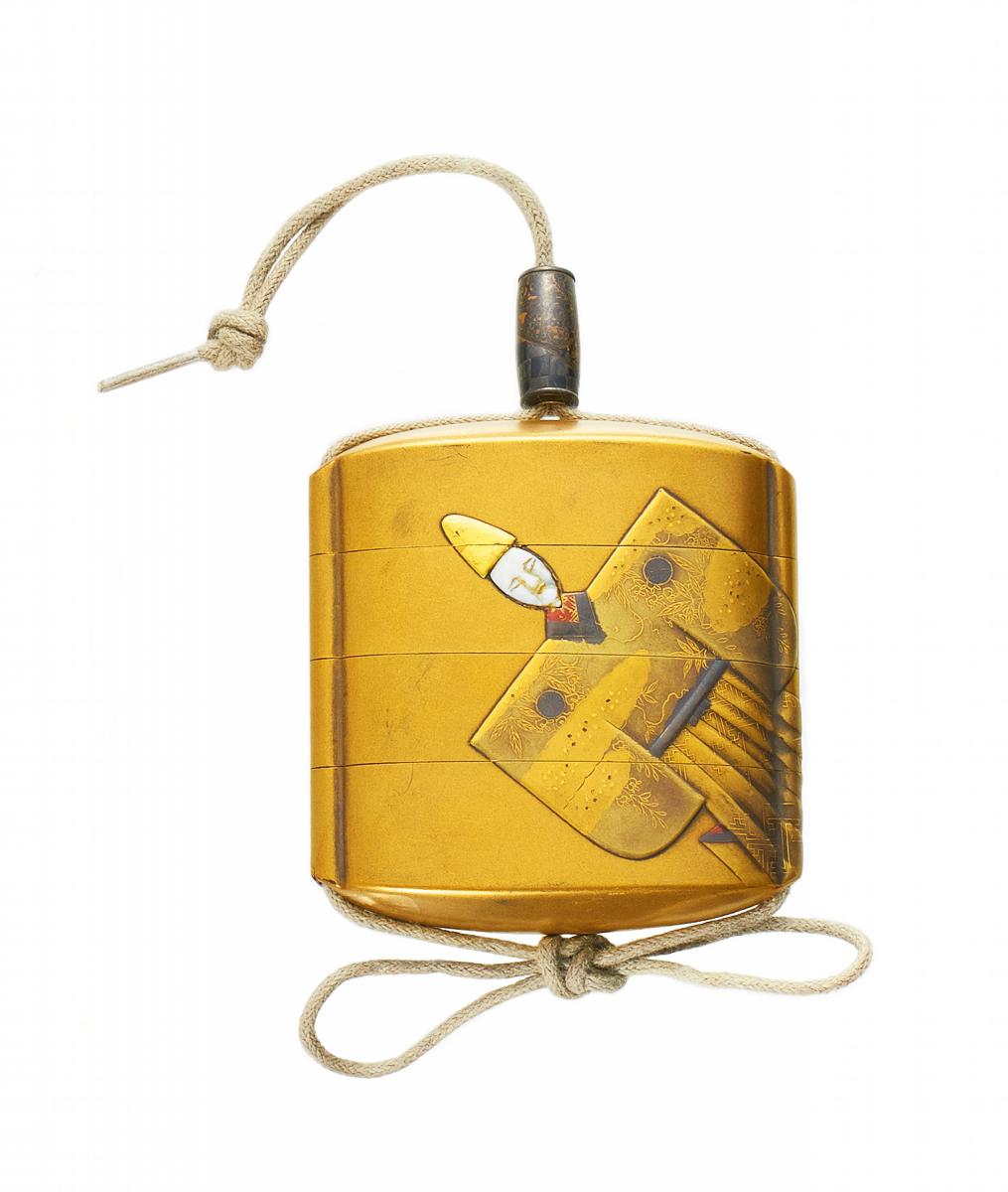 Beschreibung: Vierteilig. Auf dichtem kinji-Goldgrund in takamakie mit Details in Silber und rotem Lack