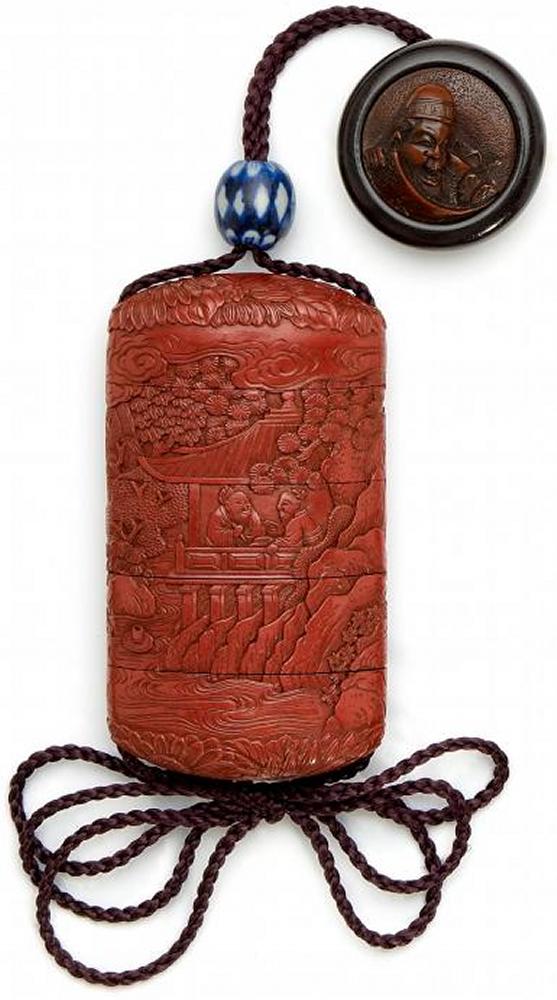 Beschreibung: Fünfteilig mit verdeckter Schnurführung. Fond tsuishu. In sehr feiner Schnitzerei