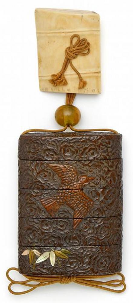 INRO: HOLZ UND LACK, VOGEL VOR WOLKEN UND MOND, NETSUKE: BAMBUSSCHEIBE, ELFENBEIN.