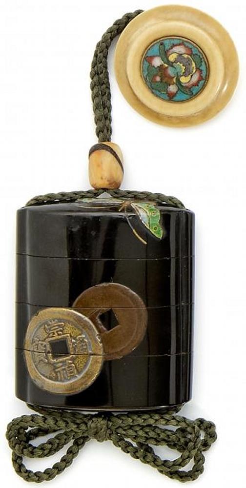 Beschreibung: Vierteilig mit abgesetzter Schnurführung. Roiro Fond mit Dekor in farbigem takamakie,