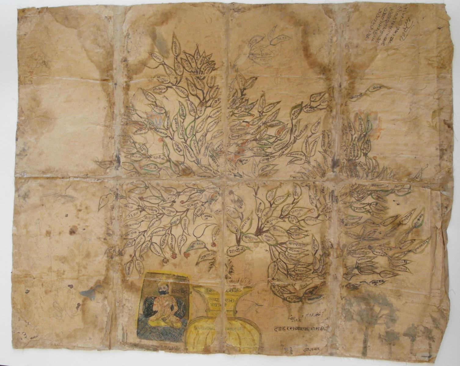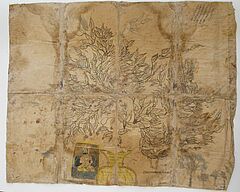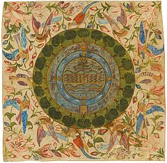 Beschreibung: a) Der Jambudvipa-Kontinent, dekoriert mit Vögeln und Blumen. 54x54cm. b) Jambuvriksa, der Wunsch-Baum. 55x70cm. c) Trilokacakra Diagramm. 43x24cm. d) Zwei Swastika, eine mit Fußabdrücken, eine mit Blumen/Punkten. Jeweils 25,5x24cm. e) Abschnitt einer Zeichnung. 31,5x17cm