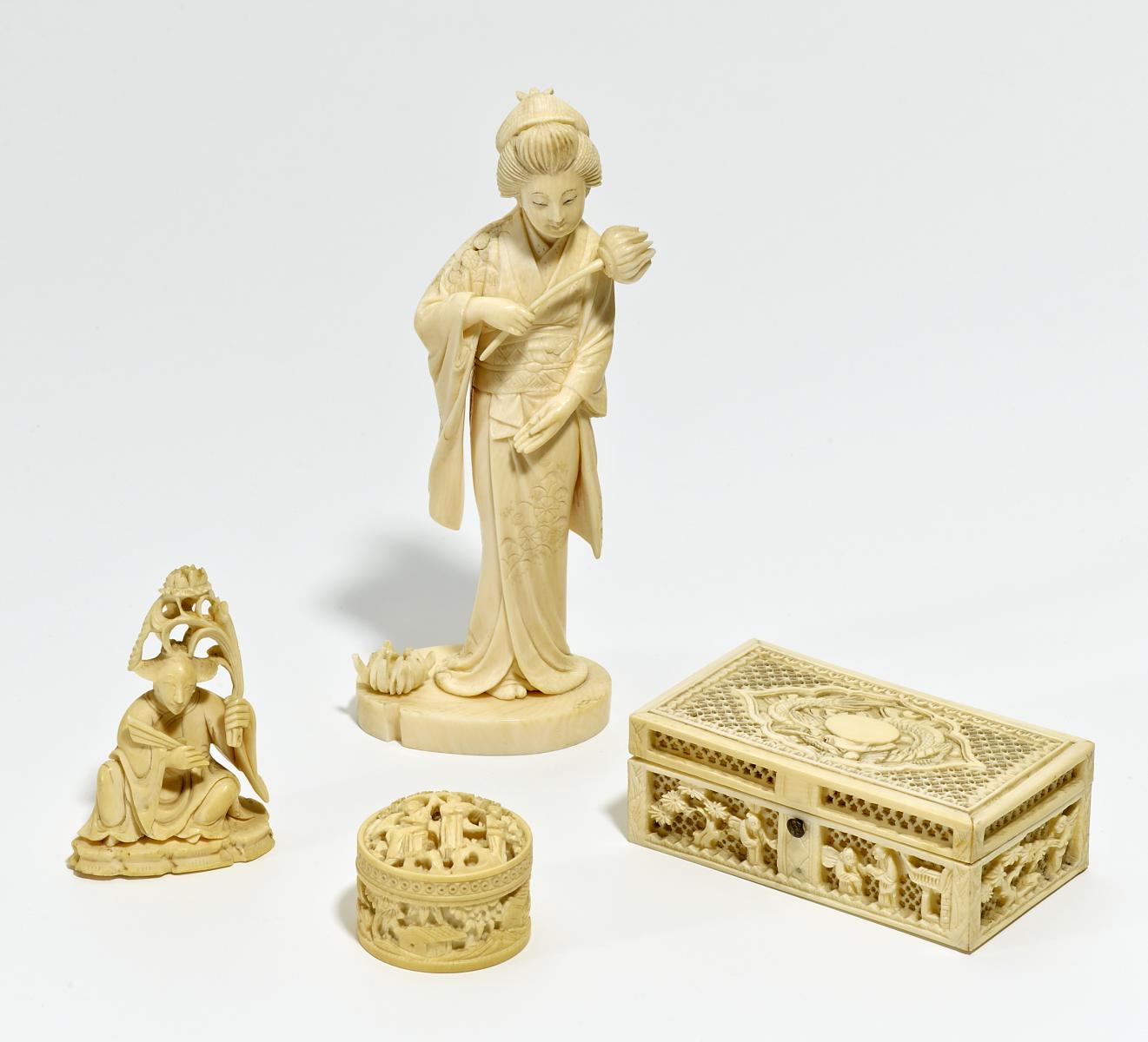 Zustand A/B. Beilage: Sitzende Dame mit Blütenzweig. Rechteckige, durchbrochen geschnitztes Kästchen. Runde Dose mit Schraubdeckel, darin gravierte Perlmuttscheibchen.