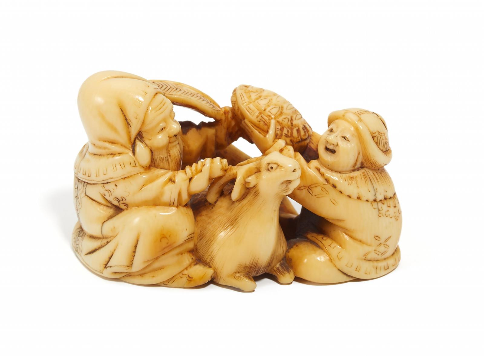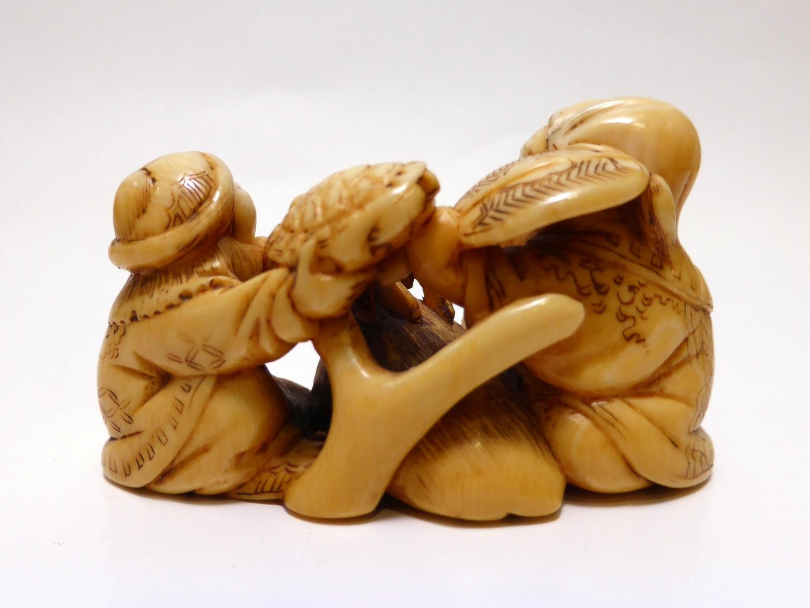 Technik: Elfenbein, sehr fein und detailliert geschnitzt und graviert, subtil eingefärbt.