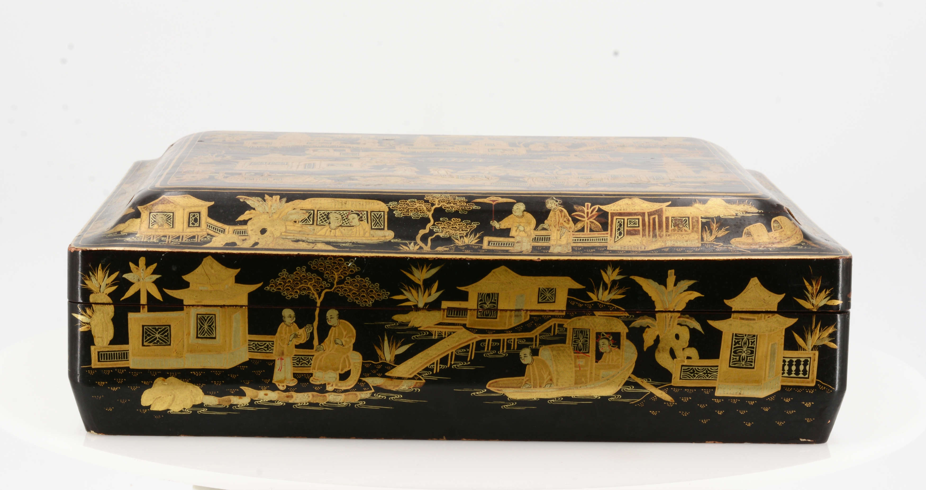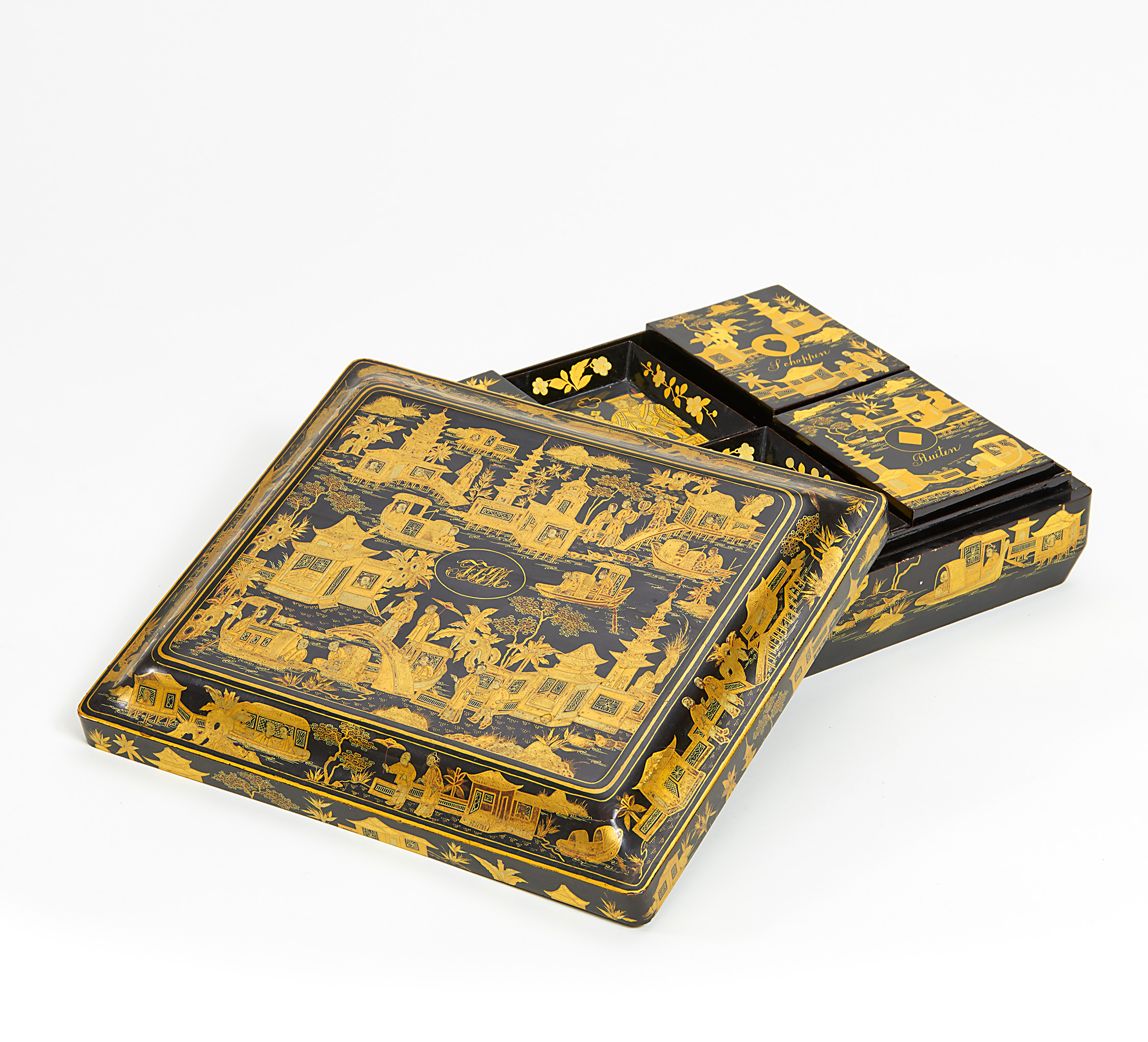 Technik: Kanton-Lack, mehrfarbiges Gold auf Schwarz. 34 rechteckige und 33 runde Spielmarken, eine als Anhänger gefasst.