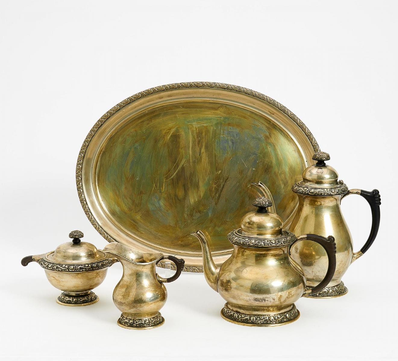 Beschreibung: Insg. 5 Teile, best. aus Kaffeekanne, Teekanne, Sahnegießer, Zuckerdose, Tablett.